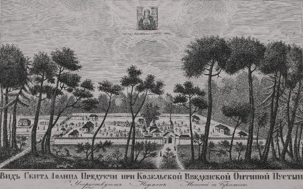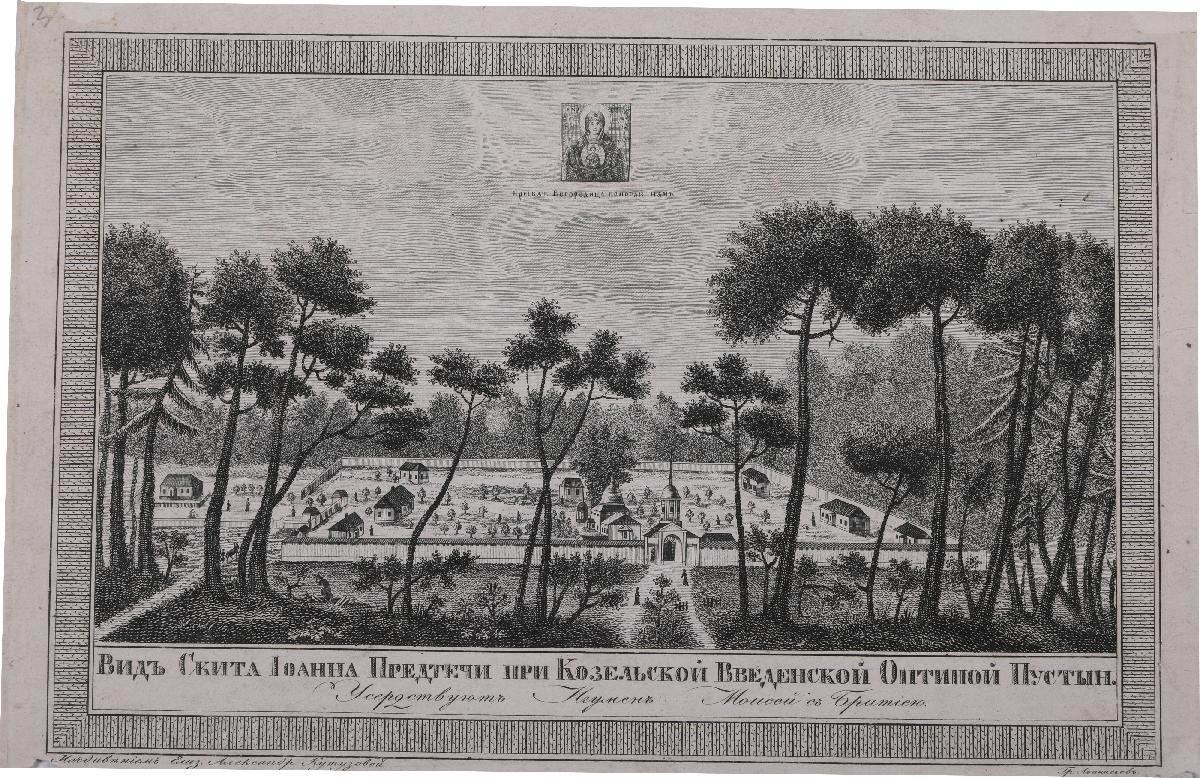Вид скита Иоанна Предтечи при Козельской Введенской Оптиной пустыни. Гравюра.
