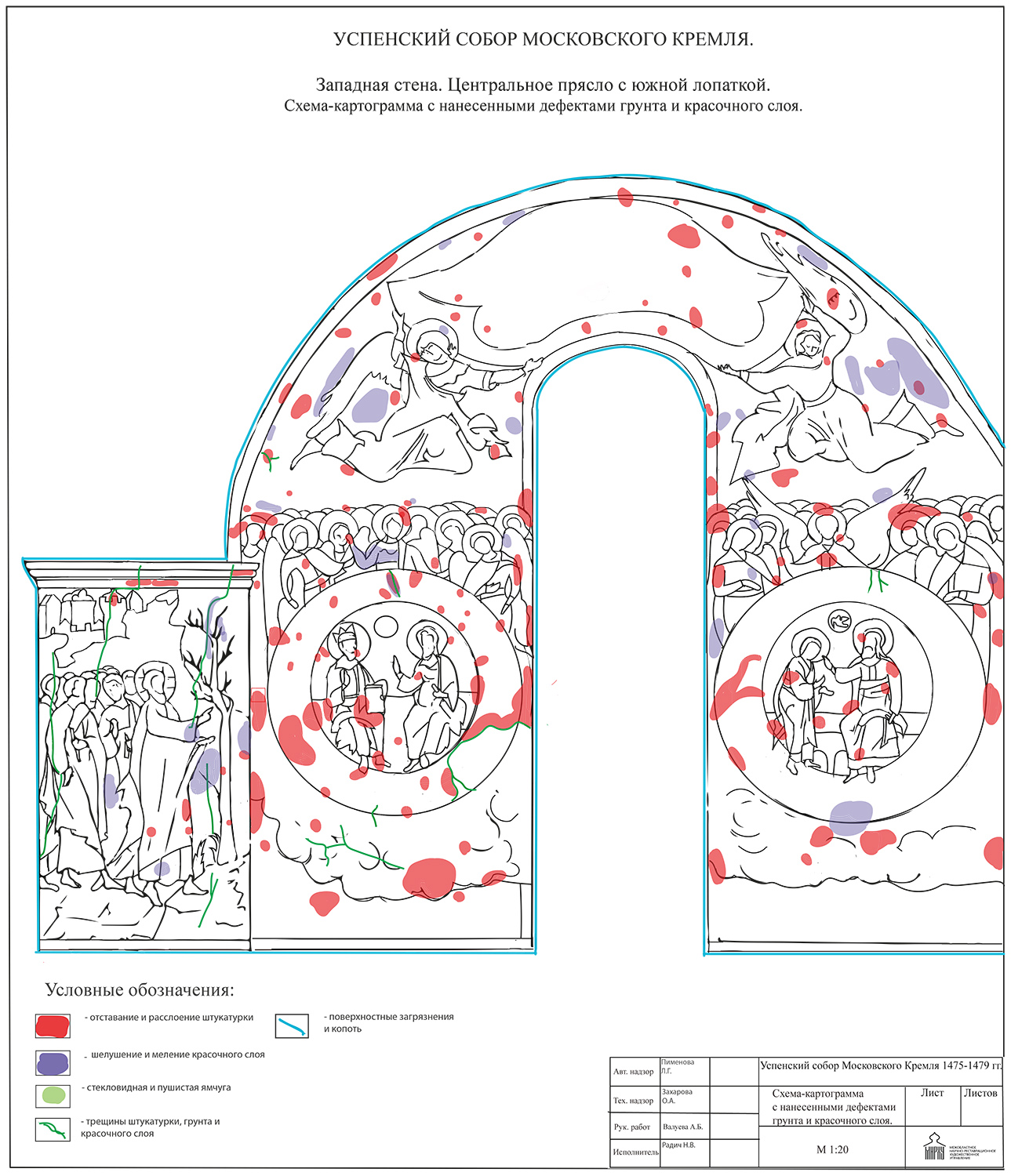 Схема-картограмма западной стены (центральное прясло с южной лопаткой) Успенского собора Московского Кремля.