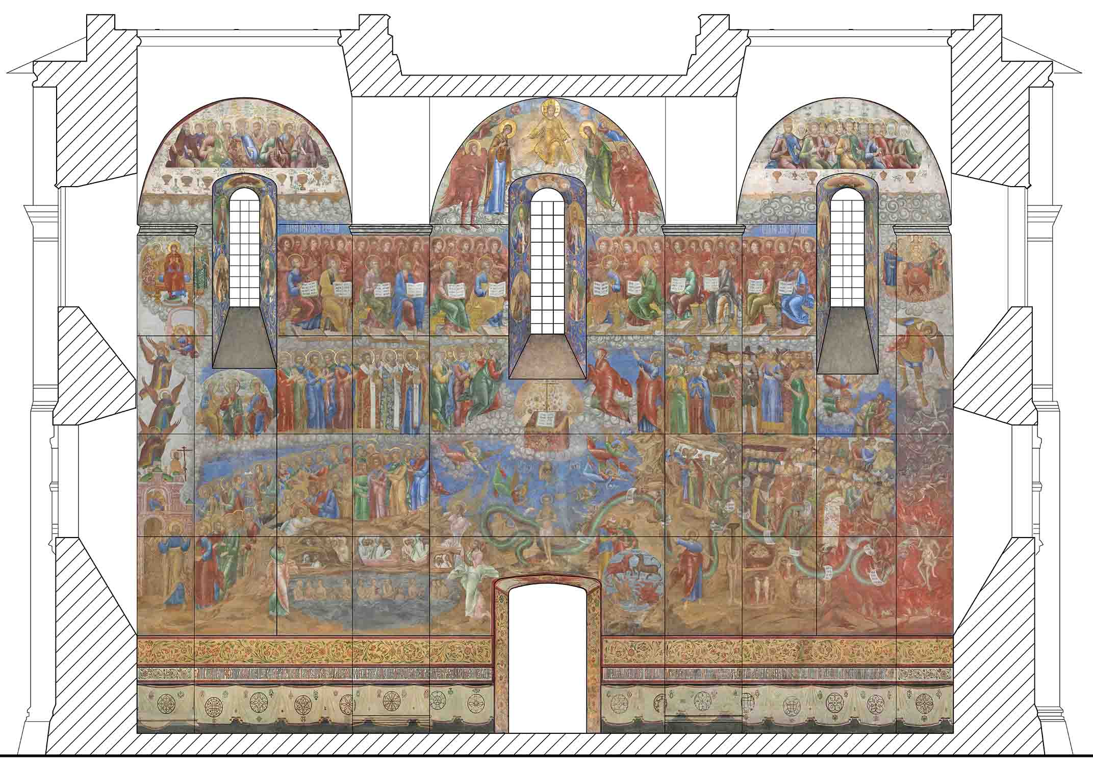 В XV – начале XVI века композиционная схема Страшного суда в русском искусстве изменилась. В ее составе появились новые сюжеты, характерные именно для русского искусства. Величайшим памятником этого периода можно назвать Троицкий собор Троице-Сергиевой лавры (1635 год).