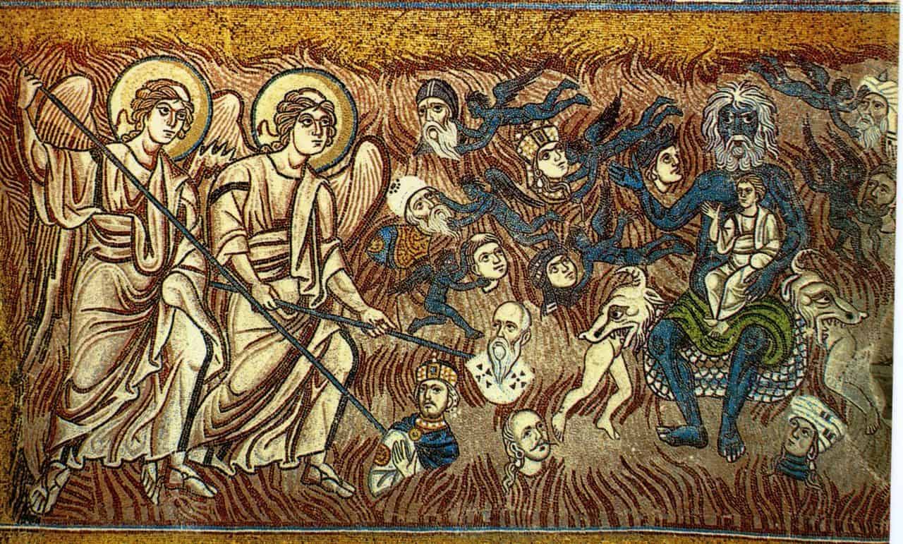 Но как изобразить такой сложный пророческий сюжет? Иконография Страшного суда опирается на тексты Нового Завета: рассказ Самого Спасителя о Втором пришествии – «Отделение овец от козлищ», «Притча о десяти девах» и т. д. (в основном это евангельские повествования апостолов Матфея и Иоанна), Откровение Иоанна Богослова или Апокалипсис. С конца первого тысячелетия интерес к эсхатологической теме (то есть теме Страшного суда и конца света) заметно возрос. Сложение иконографической схемы началось с IX века и приняло традиционный вид к XI веку. Это событие совпало со временем появления в росписях храмов литургических изображений, а также с распространением христианства среди новых народов. Миссионерская назидательная роль изображения Страшного суда известна историкам. Достаточно вспомнить, что именно иллюстрация Страшного суда произвела сильнейшее впечатление на русского князя Владимира, которому эту картину показал приезжий из Византии монах-философ (существует похожая легенда про болгарского князя Бориса).