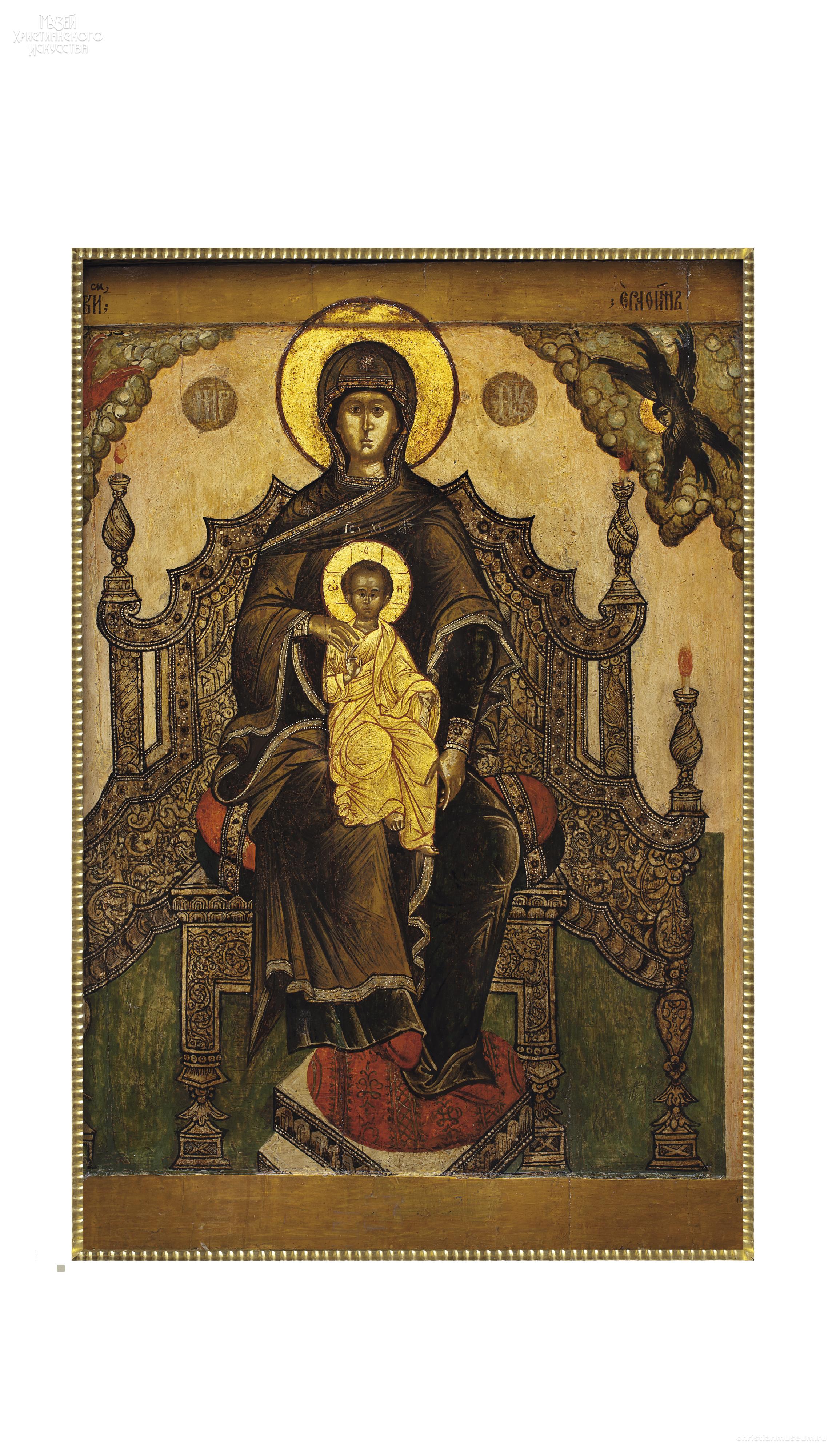 Икона Богоматери с Младенцем на престоле расположена в местном ряду иконостаса Покровского храма слева от Царских врат. Изображение Богоматери на престоле, придерживающей Младенца правой рукой за плечо и левой за ножки, относится к одному из древнейших иконографических типов. В строгой фронтальной позе Богоматерь восседает на богато орнаментированном престоле с причудливой формы спинкой с резным верхним краем, увенчанной четырьмя горящими свечами. В углах иконы в облаках изображены Серафимы и Херувимы.