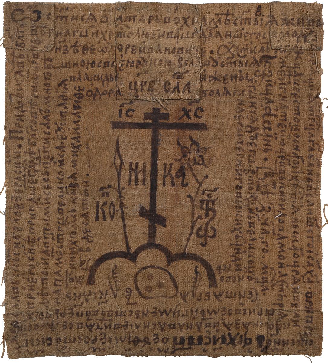 В центре - изображение восьмиконечного Голгофского креста с тростью и копьем на ступенчатом основании с надписями: Ц[А]РЬ СЛ[А]ВЫ, НИКА, КОПИЕ, ТРО[С]ТЬ.