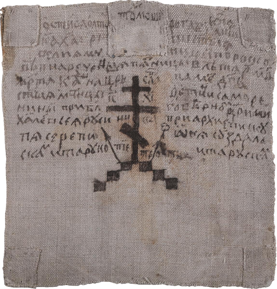 В центре - изображение восьмиконечного Голгофского креста с тростью и копьем на ступенчатом основании с надписями: Ц[А]РЬ СЛ[А]ВЫ, НИКА, КОПИЕ, ТРО[С]ТЬ.