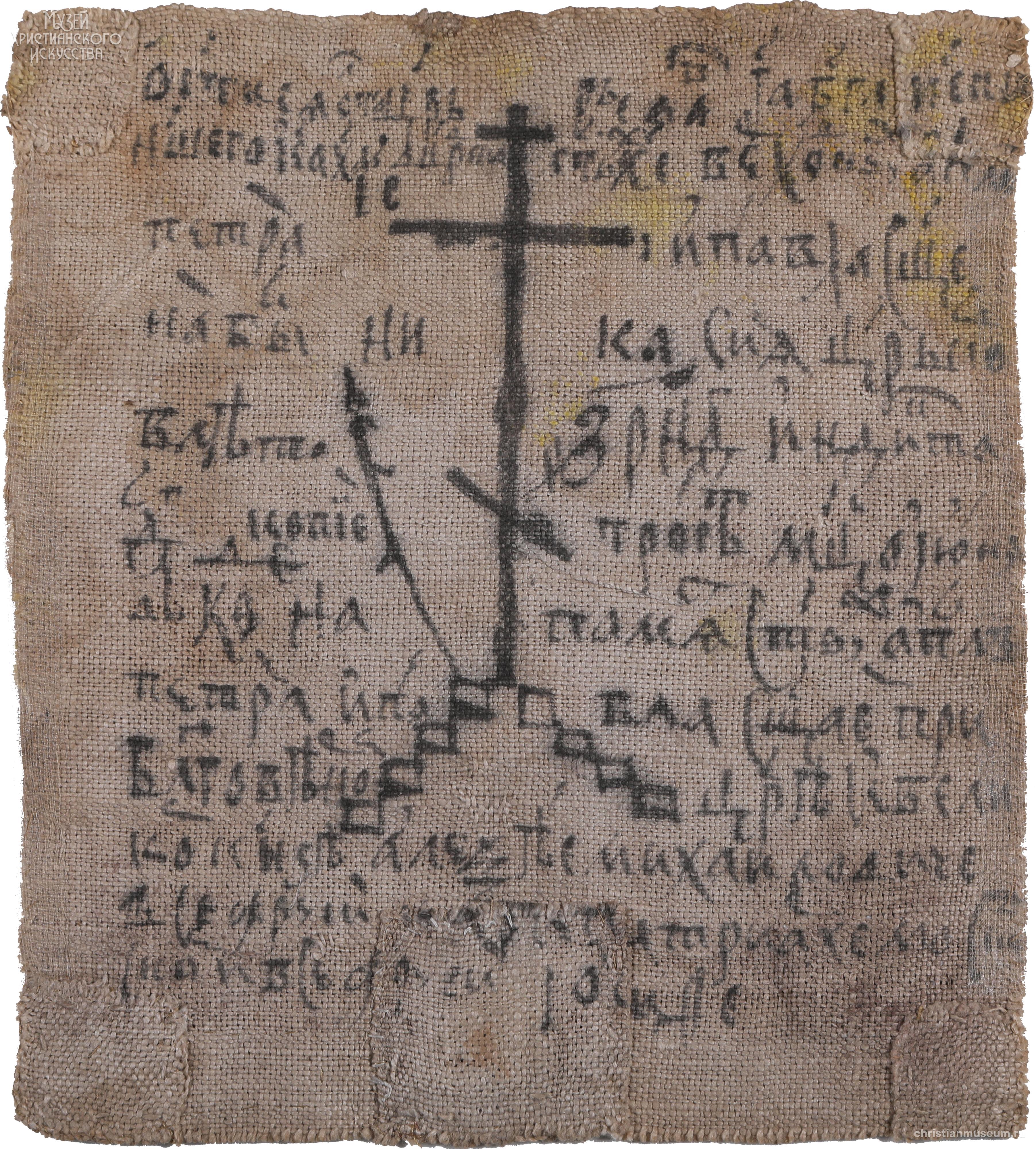 В центре - изображение восьмиконечного Голгофского креста с тростью и копьем на ступенчатом основании с надписями: Ц[А]РЬ СЛ[А]ВЫ, НИКА, КОПИЕ, ТРО[С]ТЬ. Вокруг креста - надпись полууставом
