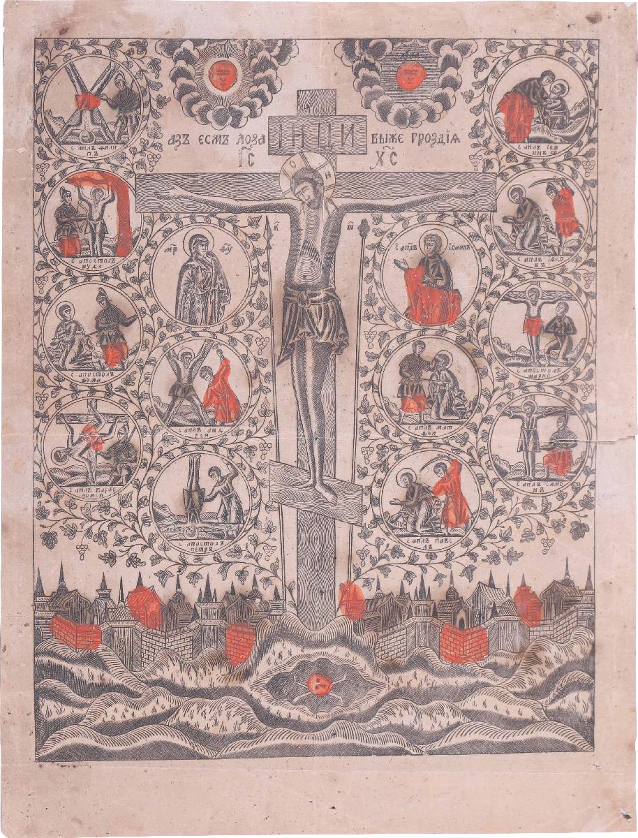 Гравюра с изображением в центре восьмиконечного креста с Распятием; слева – копие, справа - губка на трости. В навершии креста табличка «ИНЦИ», по обе стороны от неё буквы «IС ХС» и надпись «азъ есмъ лоза - выже гроздiѧ». Над крестом в облачных сияниях изображения солнца и луны с надписями – «сонце» и «луна». Внизу представлен холмистый ландшафт с условной растительностью, на заднем плане детально изображены стены и башни города (Иерусалим). В центре под крестом изображение пещеры с черепом и костьми Адама. От основания креста по обе стороны от него расходятся две виноградные лозы, которые обвивают круглые медальоны-плоды с изображением сцен мученической кончины 12 апостолов и предстоящей Богородицы («мр фу») слева, Иоанна Богослова («с аплъ їоаннъ») справа, помещенные под перекрестием. Слева от креста, начиная сверху – «с аплъ фили // пъ», «с апостолъ // иуда», «с апостолъ // фома», «с аплъ анд // реи», «с аплъ варфо // ломеи», ««с апостолъ // петръ». Справа, начиная сверху - «с аплъ їоа // ннъ бо», «с аплъ їѧко // въ», «с апостолъ // марко», «с аплъ мат // феи», «с аплъ симо // нъ», «с аплъ паве // лъ». Гравюра частично раскрашена красного краской.