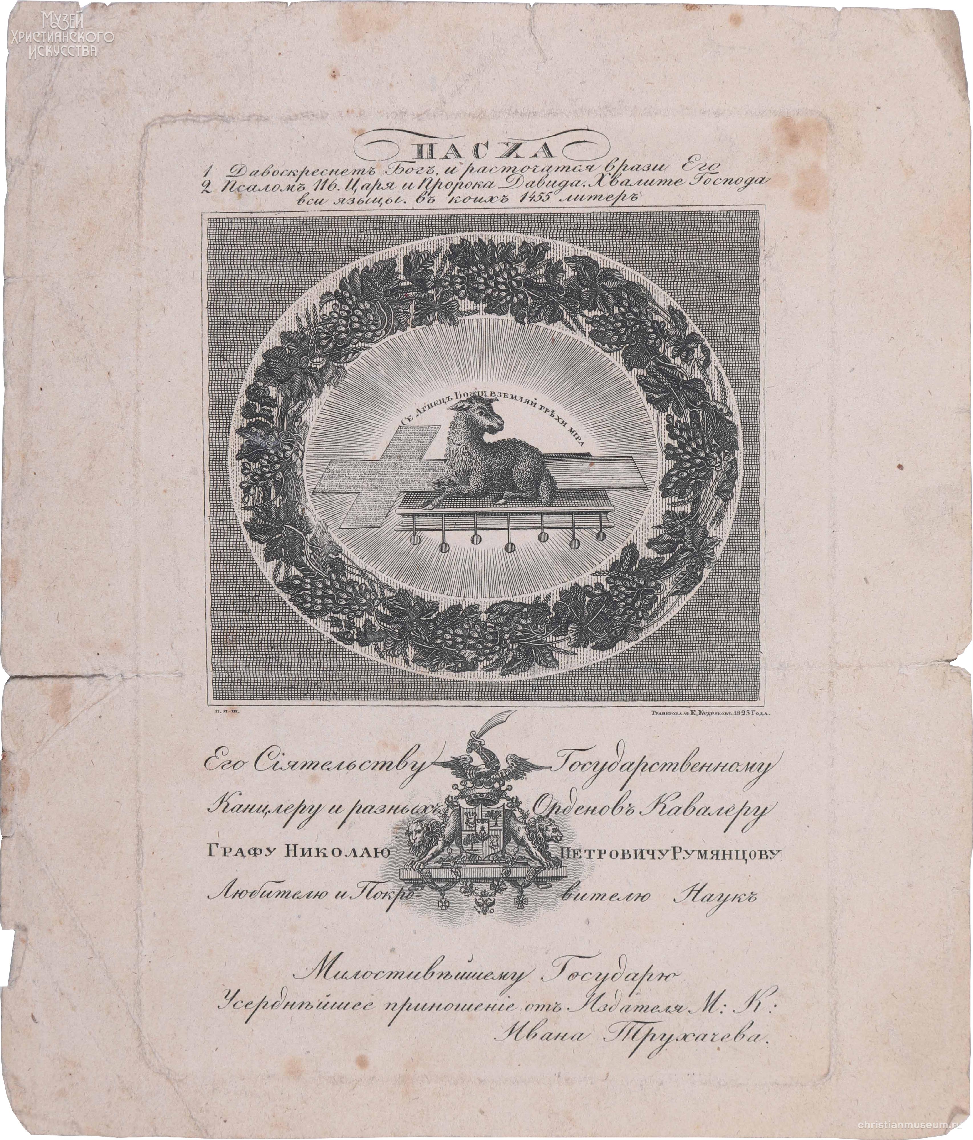 под изображением слева – «w.k.wi.»; справа – «Гравировалъ Е. Кудряковъ.1823 Года.»; над изображением – «ПАСХА // 1. Да вокреснетъ Богъ, и расточатся враги Его //2. Псалом 116. Царя и Пророка Давида. Хвалите Господа // вси языцы, в коихъ 1455 литеръ.»; под изображением по сторонам герба – «Его Сиятельству Государственному //Канцлеру и разныхъ Орденовъ Кавалеру // Графу Николаю Петровичу Румянцеву // Любителю и Покровителю Наукъ // Милостивљйшему Государю //Усерднљйшее приношенiе отъ Издателя М: К:// Ивана Трухачева.»Иконография: