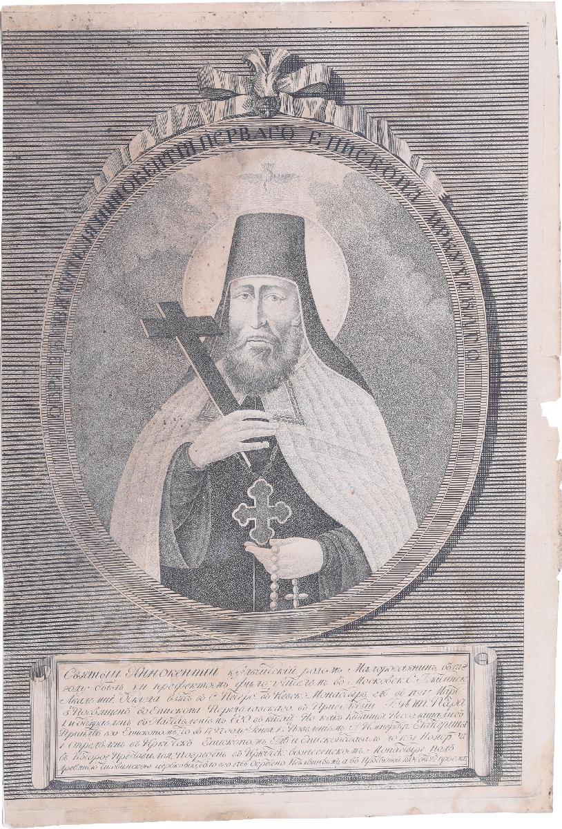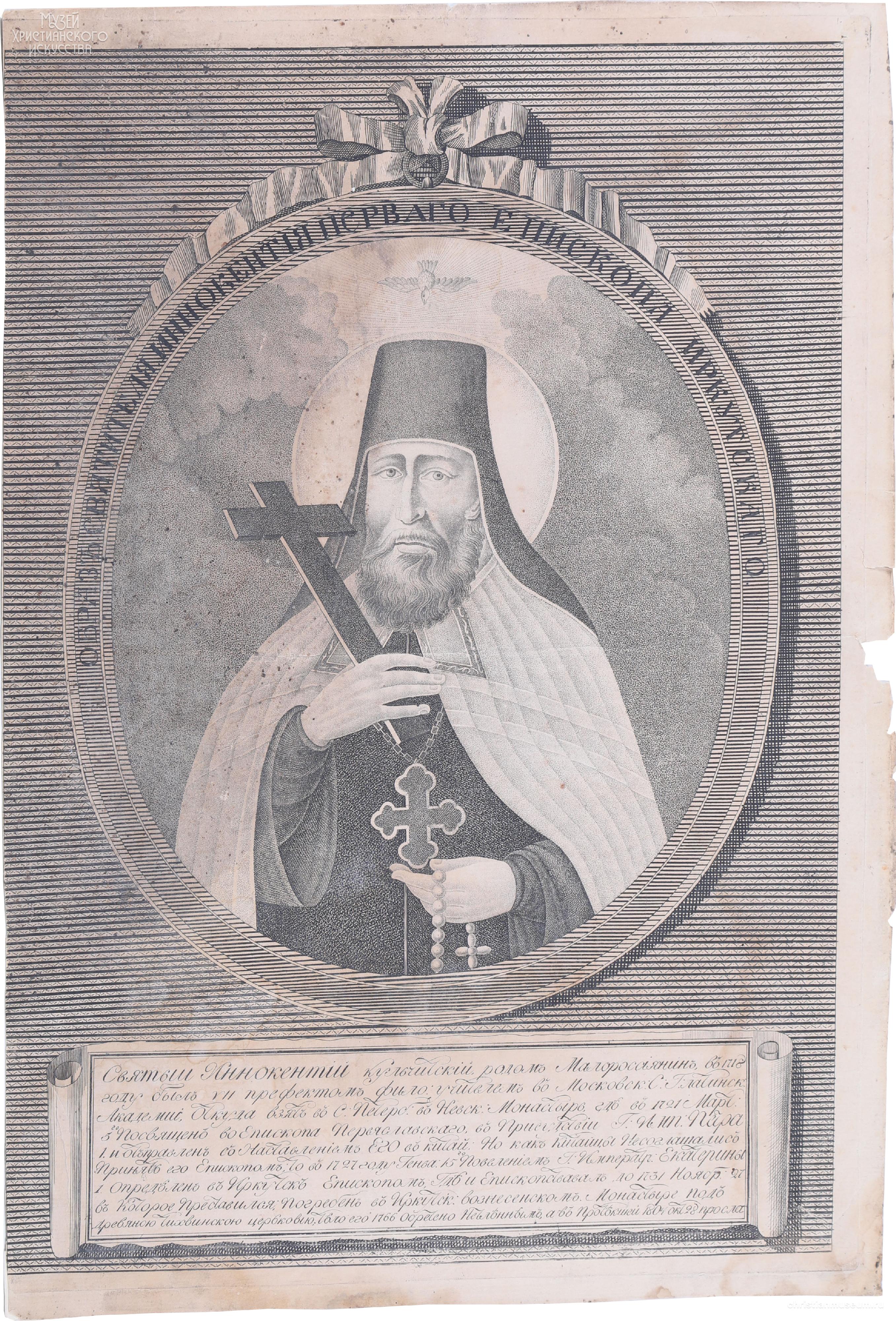 Исторический портрет представляет иконный поясной образ Святителя на фоне облачного неба со Святым Духом в сиянии над нимбом. В руках крест и четки. Изображение заключено в овальную раму с лентами, завязанными бантом над овалом, на нейтральном фоне. По раме надпись – «ОБРАЗЪ СВЯТИТЕЛЯ ИННОКЕНТIЯ ПЕРВАГО ЕПИСКОПА ИРКУТСКАГО.» Под рамой помещен горизонтально развернутый свиток с текстом.