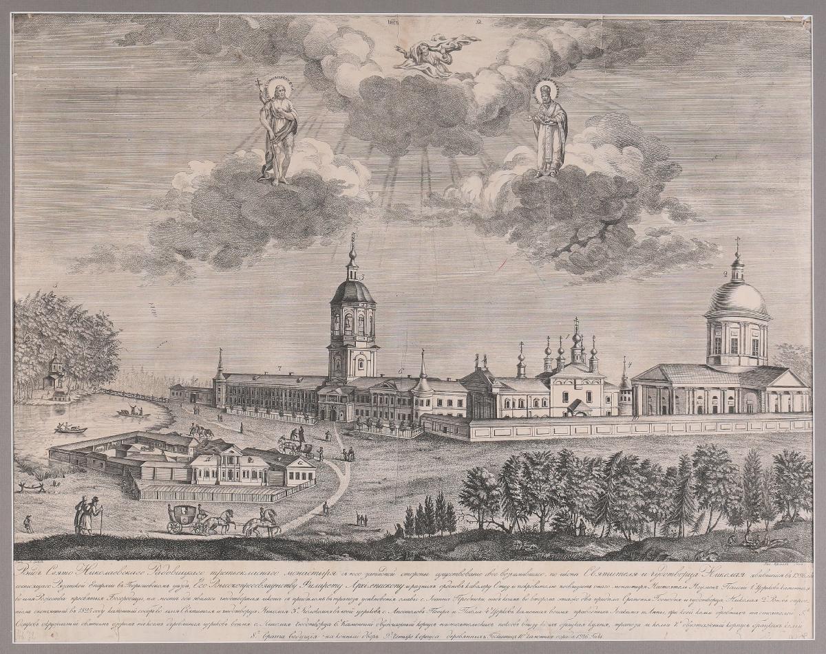 Под изображением в шесть строк – «Видъ Свято-Николаевскаго Радовицкаго третьекласнаго монастыря съ юго западной стороны существованiе свое возъимљвшаго по иконљ Святителя и чудотворца Николая явившейся въ 1396 год, состоящаго Рязанской Епархiи въ Георгиевскомъ уљздљ, Его Высокопреосвященству Филарету Архiепископу и разныхъ орденовъ кавалеру Отцу и покровителю посвящаетъ онаго монастыря Настоятель Игуменъ Паисiй. 1. Церковь каменная // во имя рождества пресвятыя Богородицы, на местљ гдљ явилась чюдотворная икона съ придљломъ усљкновенiя главы с. Iоанна Предтечи, надъ коимъ во втором этаже два придљла Сретенiя Господня и чудотворца Николая 2. Вновь строе- // нiемъ окончянный въ 1825 году каменный соборъ во имя Святителя и чюдотворца Николая. 3. Колокольня въ коей церковь с. Апостоловъ Петра и Павла 4. Церковь каменная воимя праведныхъ Iоакима и Анны, при коей кельи древнихъ настоятелей 5.// Островъ окружаемый святымъ озером на коемъ деревянная церковь воимя с. Николая Чюдотворца 6. Каменный двухэтажный корпусъ настоятельскихъ покоев внизу коих брацкая кухня, трапеза и кельи 7. Двухэтажный корпус брацкихъ келiй // 8. Врата ведущiя на конный дворъ 9. Четыре корпуса деревянныхъ Гостиницъ 10. Каменная ограда 1826 Года.»