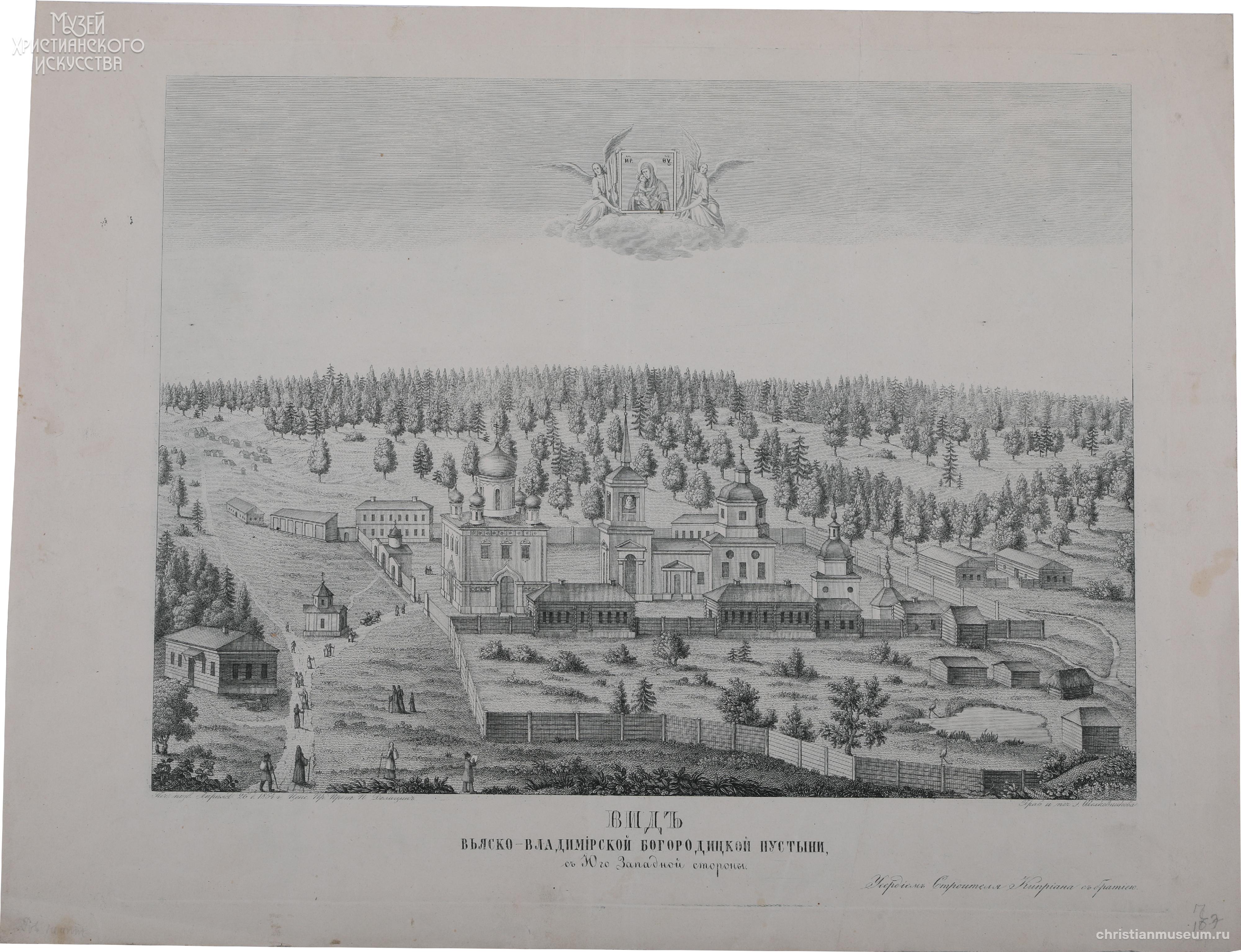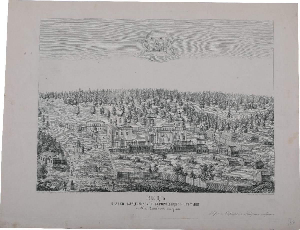 под изображением слева - «Печ. Позв. Апрљля 26 д. 1854 г. Ценс. Пр. Прот. П. Делицынъ.»; справа – «Грав. и печ. I. Шелковникова.»; «ВИДЪ //Вьско-Владимiрской Богородицкой пустыни, // съ Юго-Западной стороны.»; «Усердiемъ Строителя Кипрiана съ братiею.»Иконография: