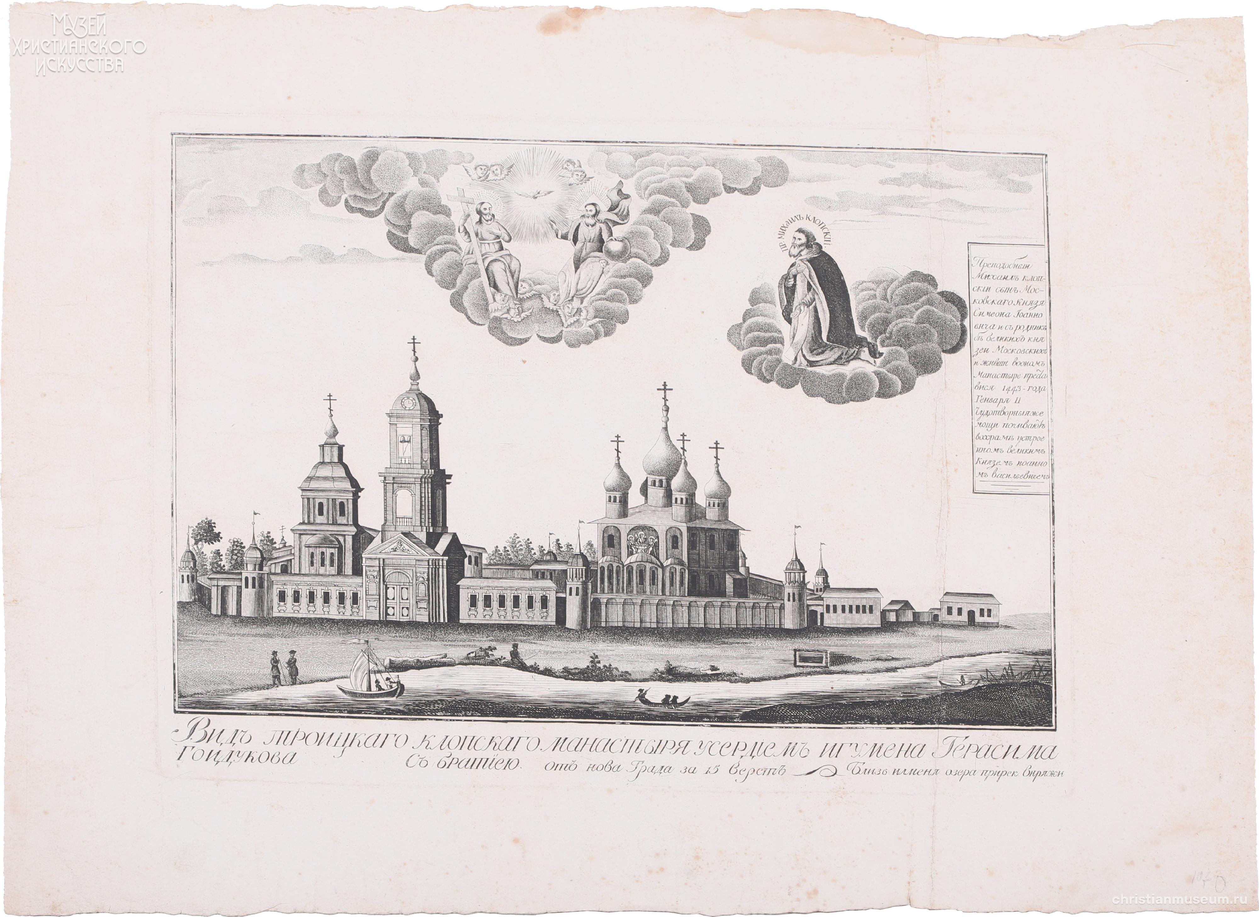 под изображением - «Видъ троицкаго кловскаго манастыря усердiемъ игумена Герасима //Гойдукова Съ братїею. Отъ нова Града за 15 верстъ Близъ илменя озера прирек. виряжи.»Иконография: