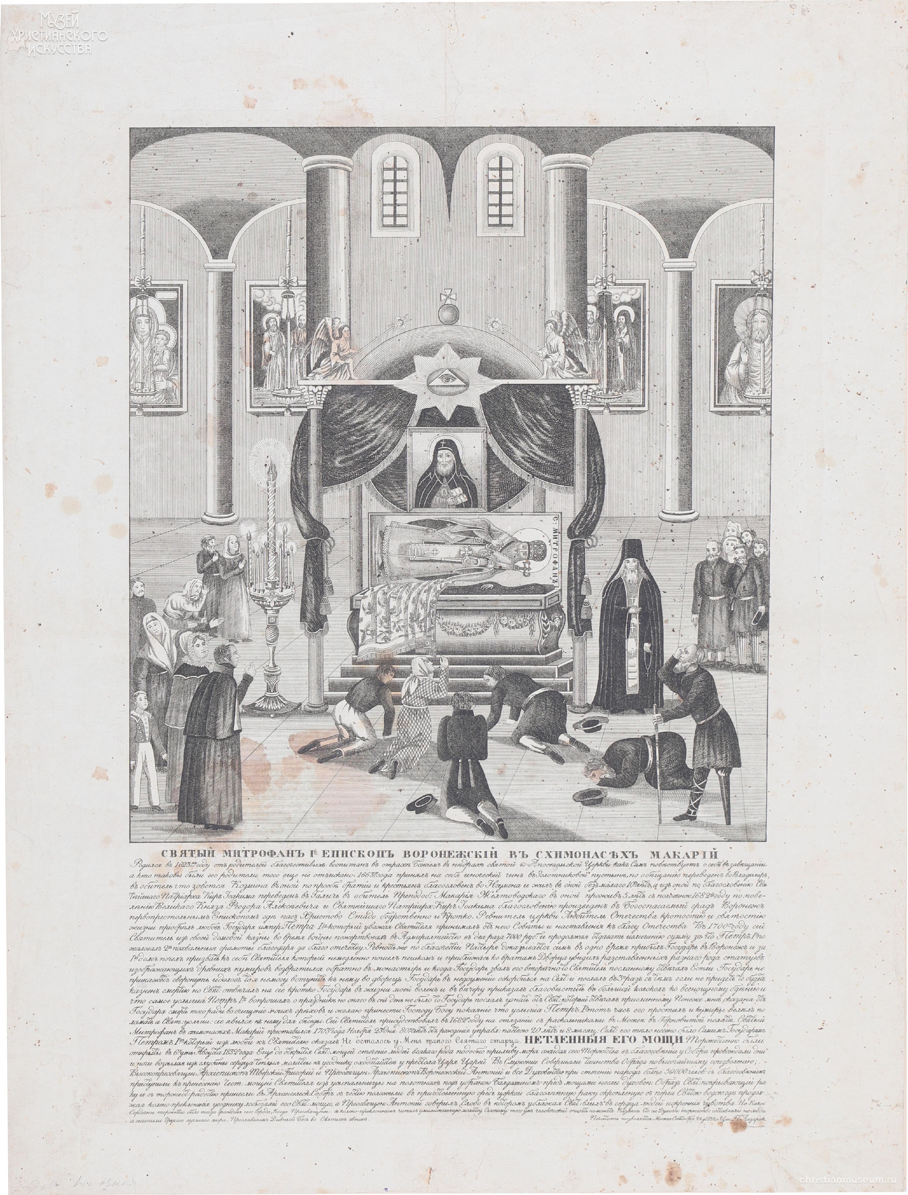 В центре композиции под сводами собора изображена рака с мощами Святителя Митрофана Воронежского, за ней иконный образ Святого, помещенный под сенью с балдахином. Вокруг – молящийся народ. Надпись под изображением в 26 строк – «СВЯТЫЙ МИТРОФАНЪ Iй ЕПИСКОПЪ ВОРОНЕЖСКİЙ ВЪ СХИМОНАСЕХЪ МАКАРIЙ. // Родился въ годе отъ родителей благочестивыхъ воспитанъ въ страхе Божiемъ въ недрахъ святой…»
