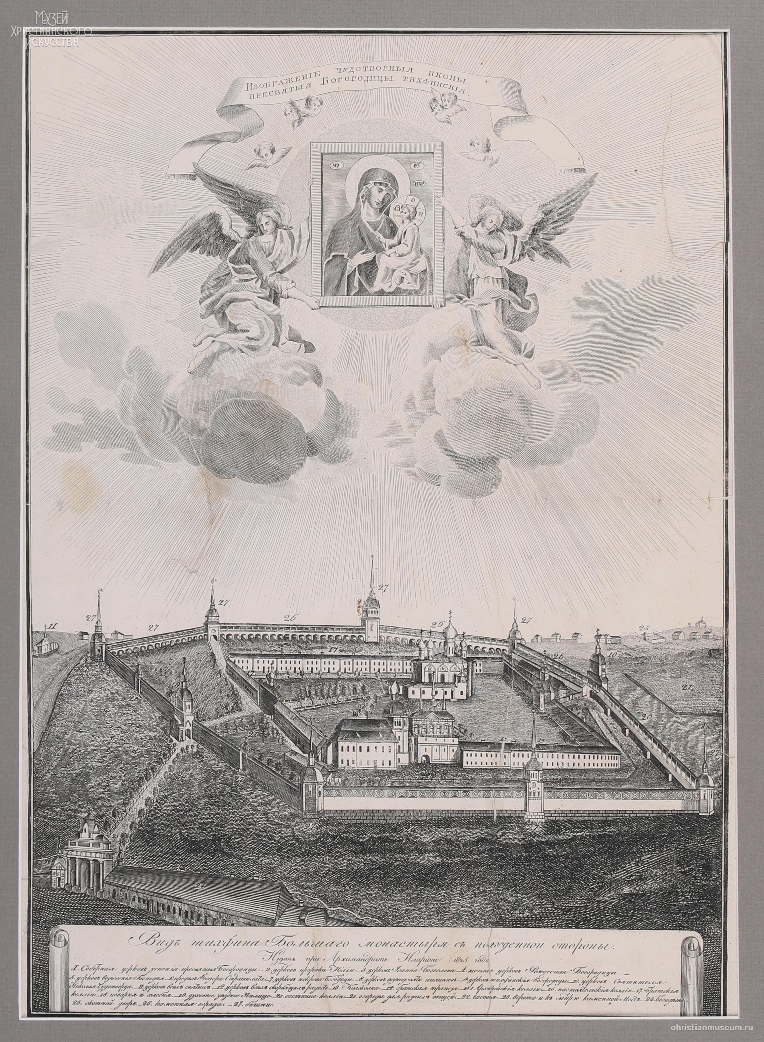 под изображением – «Видъ тихфина Большаго монастыря съ полуденной стороны. // Издан при Архимандрите Иларiоне 1825 года.Иконография: