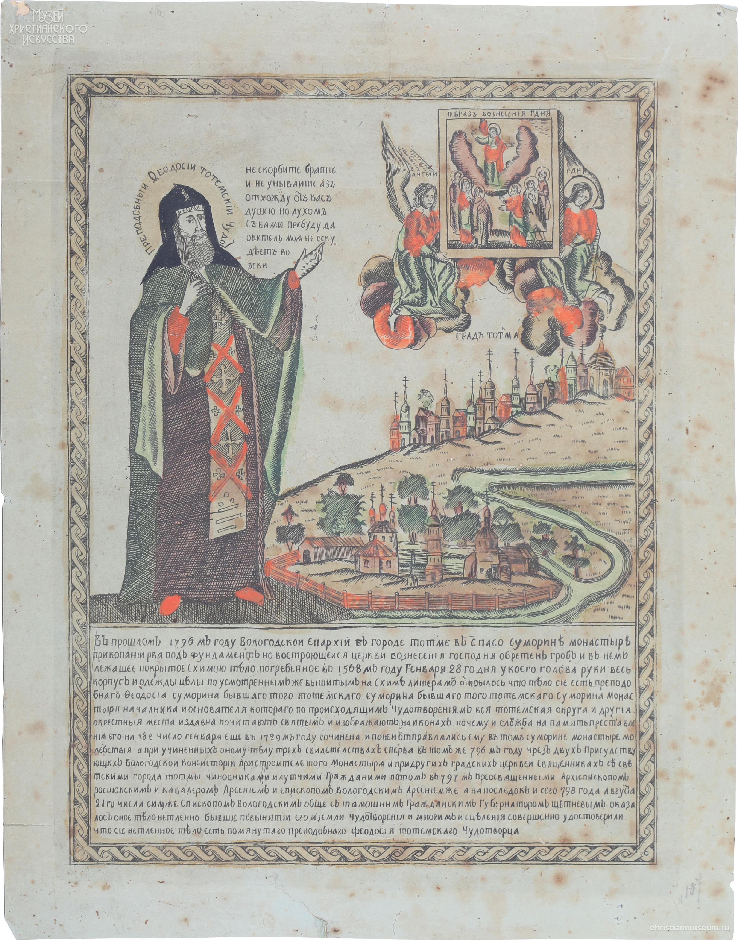 Под изображением текст в пятнадцать строк, повествующий историю обретения святых мощей преподобного Феодосия Тотемского в 1796 году - «Въ прошломъ 1796 мъ году Вологодской епархıи въ городе тотме въ спасо суморинђ монастырђ // при копанiи рва подъ фундаментъ новостоящейся церкви вознесенiя господня и обретенъ гробъ и в немъ // лежащее покрытое Схимою тђло, погребенное въ 1568 году Генваря 28го дня у коего голова руки весь // корпусъ и одежды цълы по усмотреннымъ же вышитым на схимђ литерамъ открылось, что тђло сiе есть преподо- // бнаго Ѳеодосiя Суморина бывшаго того тотемскаго суморина бывшаго того же тотемскаго суморина монас- // тыря начальника и основателя котораго по происходящимъ Чудотворениямъ вся тотемская округа и другiя // окрестныя места издавна почитаютъ святымъ и изображаютъ на иконахъ почему и служба на память преставле- // нiя его на 28е число генваря еще в 1729мъ году сочинена и поней отправлялись ему в томъ суморине монастыре мо-// лебствiя а при учиненыхъ оному тђлу трехъ свидетельствахъ сперва въ томъ же 796мъ году чрезъ двухъ присудству-// ющихъ Вологодской Консисторiи при строителе того монастыря и при другихъ градскихъ церквей священниковъ съ све- // тскими города Тотьмя чиновниками и лутчими гражданами потомъ в 797мъ году преосвященными Архiепископомъ // ростовскимъ и кавалеромъ Арсенiемъ и епископомъ Вологодскимъ Арсенiемъ же и напоследокъ и сего 798 года августа // 21го числа симъ же Епископом Вологодскимъ обще съ тамошнимъ Гражданскимъ Губернаторомъ Щетневымъ оказа- // лось оное тђло нетлпенно бывше повынятiи Его из земли чудотворенiя и многимъ исцеленiя совершенно удостоверили // что сıе нетленное тђло помянутаго преподобнаго Феодосıя тотемскаго Чудотворца.»