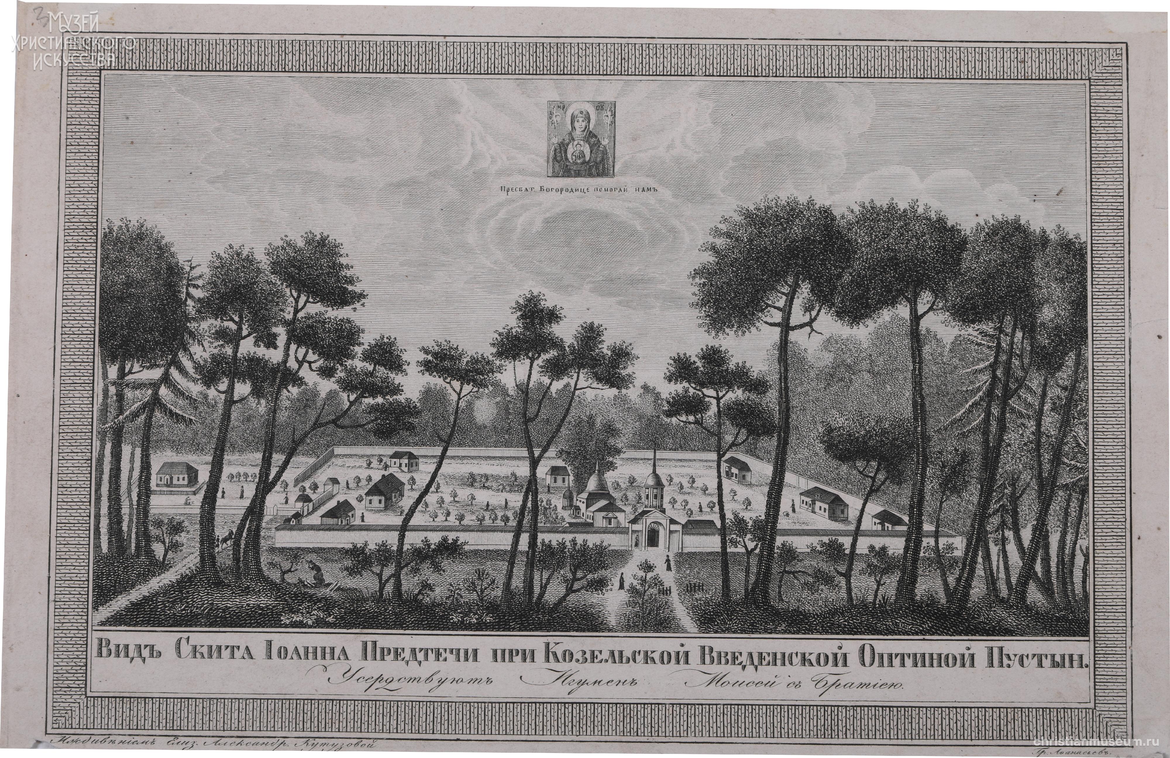 Гравюра с видом скита создавалась «иждивением Елизаветы Александровны Кутузовой» и «усердием Игумена Моисея с братиею» через десять лет после закладки первых строений, одновременно с видом Оптиной пустыни и выполнена в аналогичной манере гравирования и оформления.