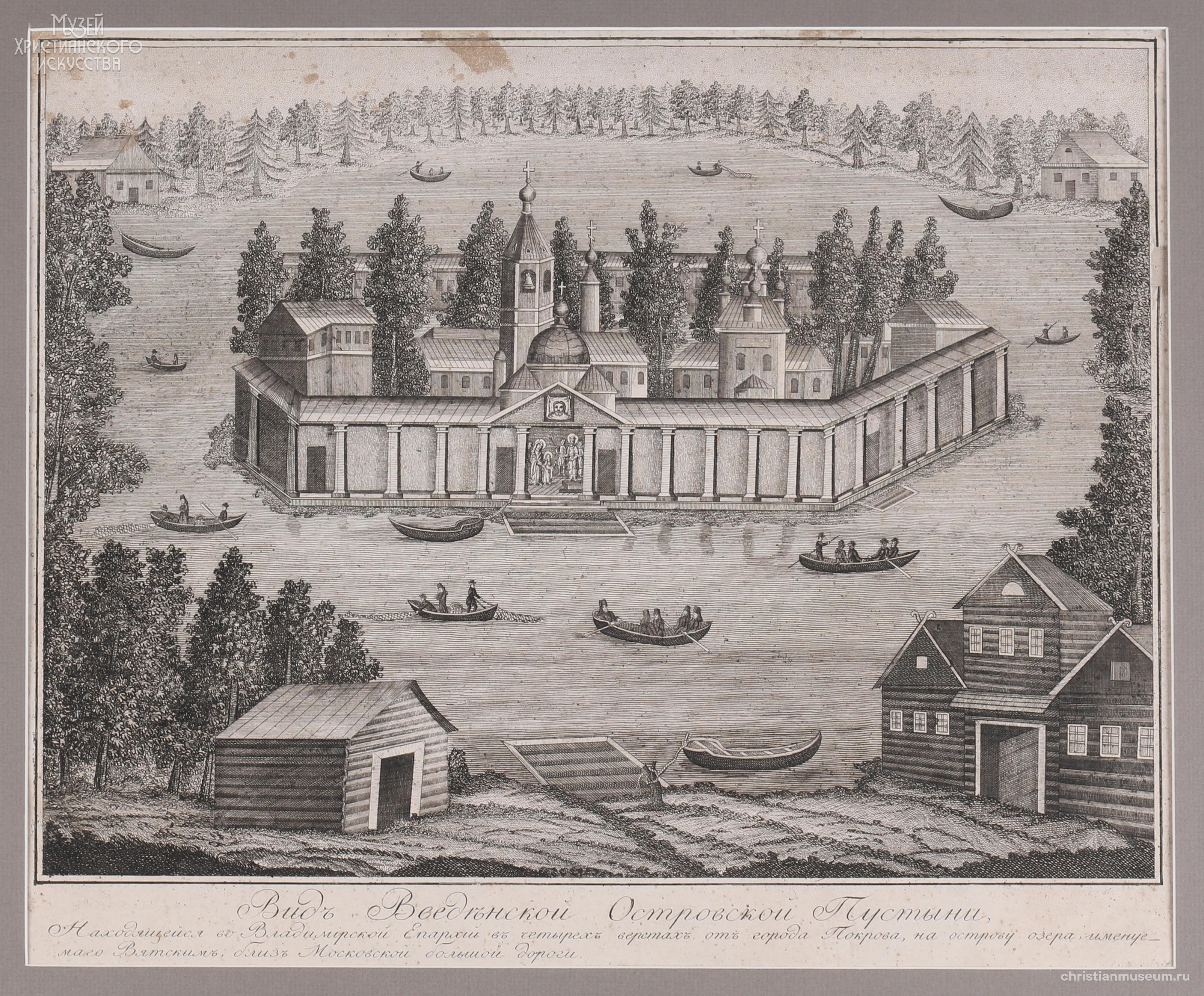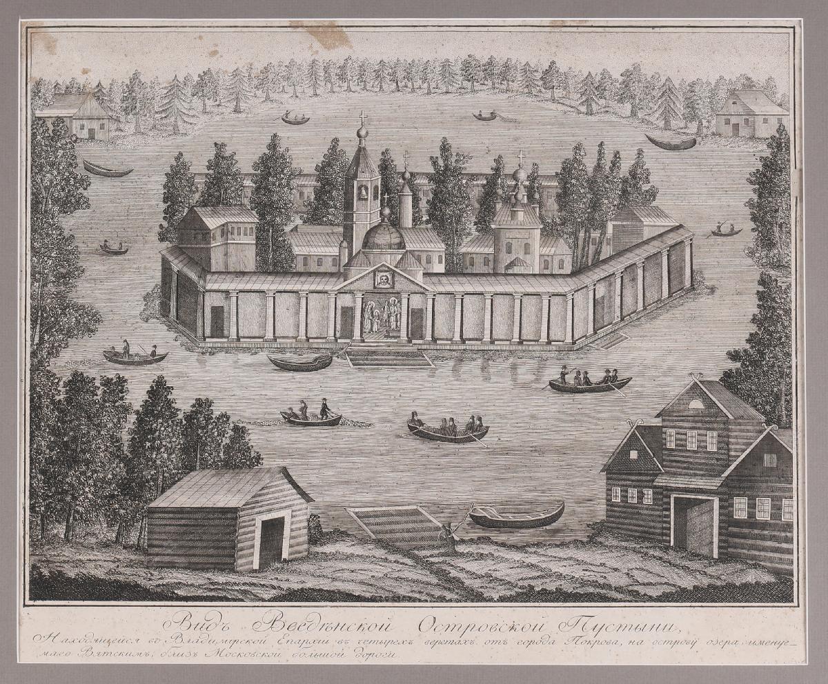 Гравюра передает состояние монастыря к концу первой трети XIX века, когда было создано две гравюры, различающиеся подробностью изображения и надписями. Более упрощенный вариант гравюры предназначался для книги Н. Самойлова «Историческое описание Введенской островной пустыни», изданной в 1830 году. Скорее всего, данная гравюра большего размера выполнялась тогда же как паломнические листы