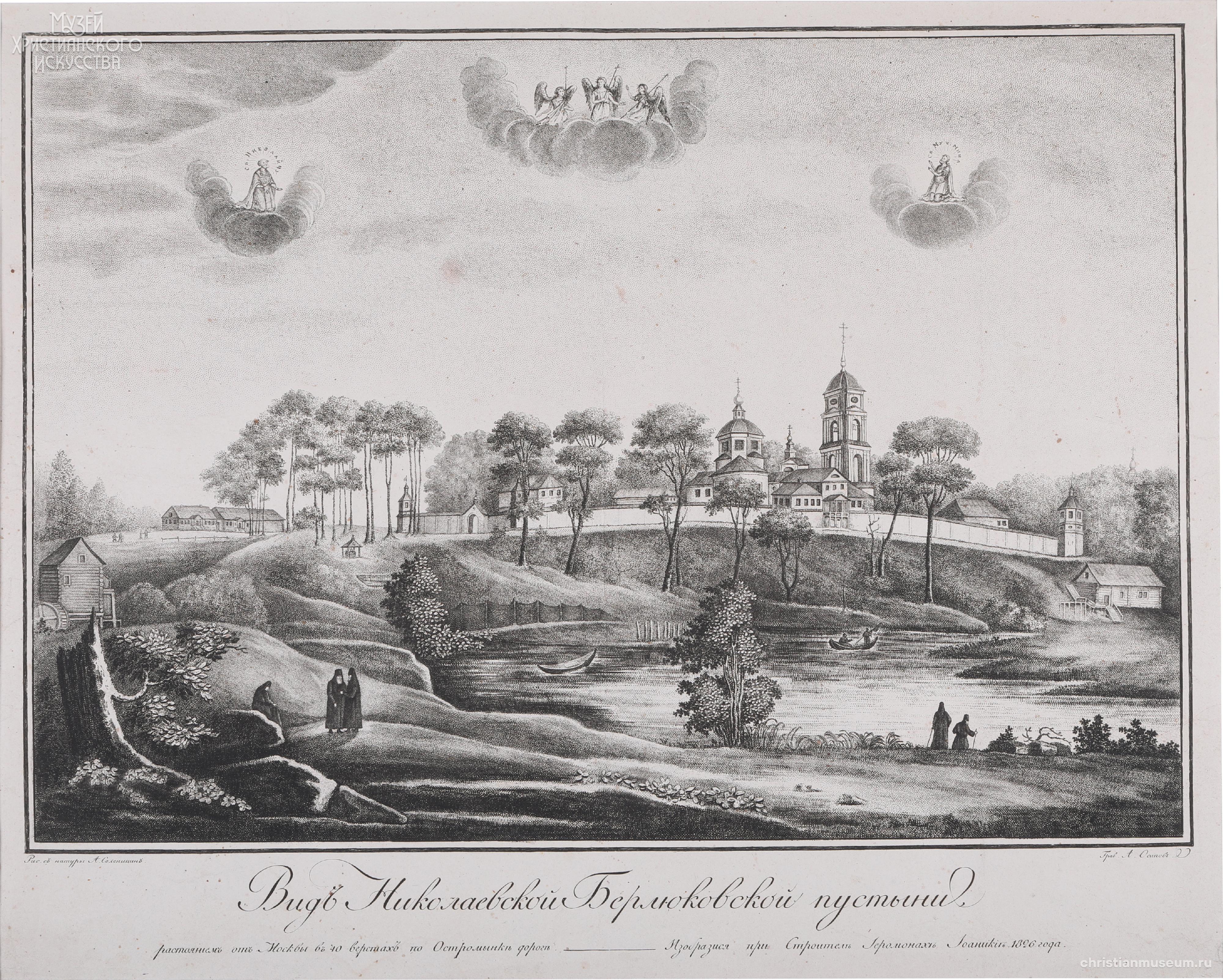 Надпись под изображением - «Видъ Николаевской Берлюковской пустыни // растоянiемъ отъ Москвы въ 70 верстахъ по Остромынкљ дороге Изобразися при Строителе Iеромонахе Iоаникiљ.1826 года.»