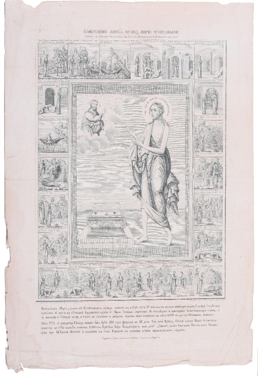 Средник окружен 22 клеймами со сценами из жития святой; над каждым клеймом надпись в одну или две строки, описывающая сюжет: 1. Преп. Маріѧ видитъ идущих во Iерусалимъ на поклоненiе. 2. Преп. Маріѧ приходитъ къ морю. 3. Преподобнаѧ Маріѧ входитъ на Корабль. 4. Преп. Маріѧ неможетъ воити въ церковь. 5. Преп. Маріѣ входъ въ церковь возбранѧетъ невидимаѧ сила. 6. Преп. Маріѧ молитсѧ ω входѣ въ храмъ предъ Иконою Пр. Богородиц. 7. Пр. Маріѧ поклонѧетсѧ Кресту Господню и благодаритъ Пр. Богоро. 8. Пр. Маріѧ во храмѣ Iоанна Предте прiiмаетъ благословен. отъ Iереѧ. 9. Пр. Маріѧ въ маломъ Кораблецѣ перевозитсѧ на друг. сторон. Iордана. 10. Преп. Маріѧ водворѧетсѧ въ пустынѣ. 11. Преподобныи Зосима въ пустынѣ. 12. Преп Зосима видитъ Преп Марiю. 13. Преподобныи Зосима достигаетъ Пр. Марiю. 14. Преп. Маріѧ проситъ у Преп Зосимы одежды покрыть наготу свою. 15. Преп Зосим даетъ Пр. Марiи верхнiю ωдежду свою. 6. Пр. Маріѧ и Пр. Зосима просѧтъ другъ у друга благословенiѧ. 7. Преп. Маріѧ во времѧ молитвы стоитъ на воздухѣ. 18. Пр. Зосима проситъ Пр. Марiю разсказать жизнь свою. 19. Пр. Маріѧ разсказываетъ Преп Зосимѣ жизнь свою. 20. Пр Маріѧ проситъ Пр. Зосиму причаститъ ее преч. Таинъ. 21. Преп. Зосима прiобщаетъ Препод Марiю Таинъ Христовыхъ. 22. Пре. Зосима находитъ Марiю умершею.