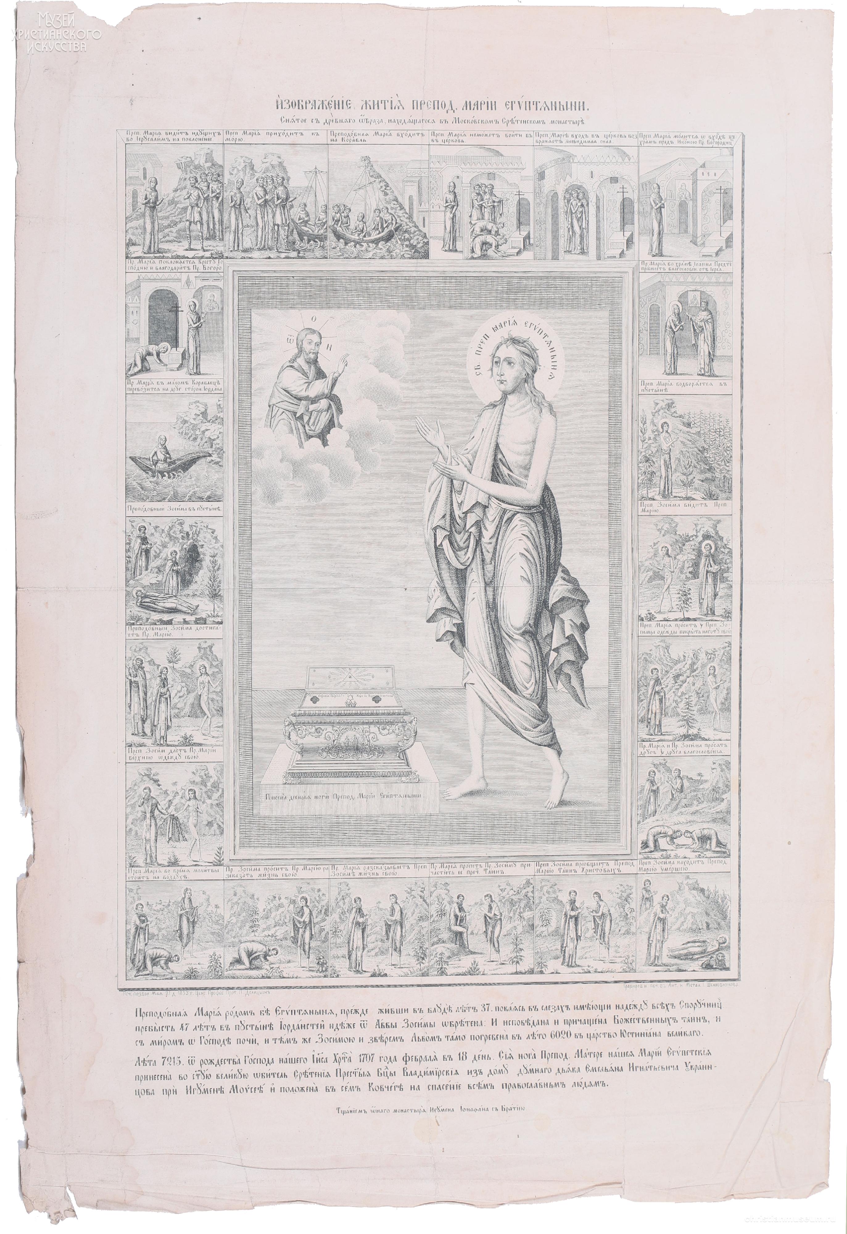 Под изображением жития расположен текст в шести строках, повествующий о блаженной кончине св. прп. Марии Египетской и принесение части её честных мощей в Сретенский монастырь в Москве - «ИЗОБРАЖЕНIЕ ЖИТIѦ ПРЕПОД. МАРIИ ЕГVПТѦНЫНИ // Снѧтое съ древнѧго ωбраза находѧщагосѧ въ Московскомъ Срђтенскомъ монастырђ»; под текстом внизу – «Тщанїемъ ωнаго монастырѧ Игумена Їонафана съ Братiею». Текст под изображением – «Преподобнаѧ Маріѧ родомъ бѣ Егνптѧнынѧ, прежде живши въ блудѣ лѣтъ 37, покаѧсь въ слезахъ имѣющи надежду всѣхъ Спо-ручниц // пребысть 47 лѣтъ въ пустынѣ Їорданстеи идѣже Ѿ Аввы Зосимы ωбрѣтена: И исповѣдана и причащена Божественныхъ таинъ, и //зъ миромъ ω Господѣ почи, и тѣмъ же Зосимою и звѣремъ Львомъ тамо погребена въ лѣто 6020 в царство Юстинїана великаго. // Лѣта 7215 Ѿ рождество Господа нашего Iиса Хрта 1707 года февралѧ въ 18 день. Сiѧ нога Препод Матере нашеѧ Марiи Егνпетскiѧ // принесена во стую великую обитель Срѣтенїѧ Престыѧ Бдцы Владимїрскїѧ изъ дому думнаго дьѧка Емельѧна Игнатьевича Украинцова при Игуменѣ Моνсеѣ и положена въ семъ Ковчегѣ на спасенїе всѣмъ православнымъ людѧмъ».