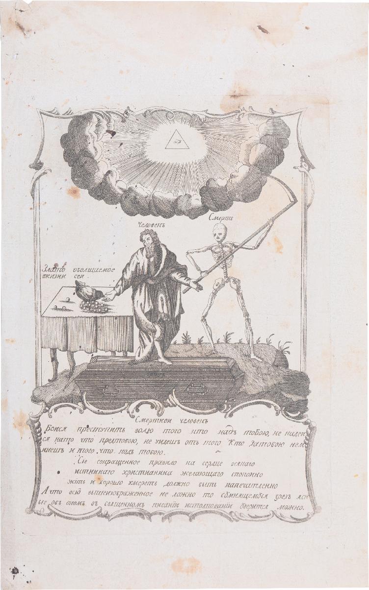 Под изображением в фигурном медальоне текст в девять строк – «Смертнои человекъ //Боися преступить волю того кто надъ тобою, не надеи // ся нато что предтобою, не уидешъ отъ того Кто затобою нем //инешь и того что подъ тобою. //Сїе сокращенное правило на сердце всякаго // истиннаго христианина желающаго спокоино // жїть и хорошо умереть должно быть напечатленно //А что всю вышеизображенное не ложно то сумнящемуся чрезъ ясн // ые объ ономъ въ священномъ писанїи истолкованїи уверится можно».