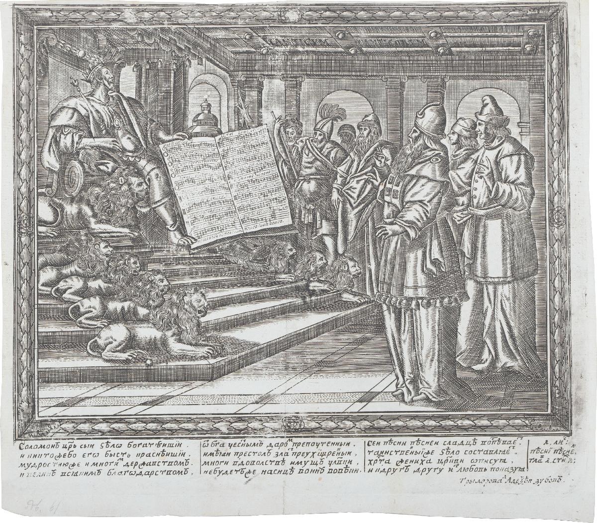В помещении с кесонированным потолком, слева восседающий на троне, помещенном на высоком ступенчатом подиуме, царь Соломон со скипетром и нотной тетрадью в руках. Справа и за троном расположены фигурки приближенных, внимающих царю.