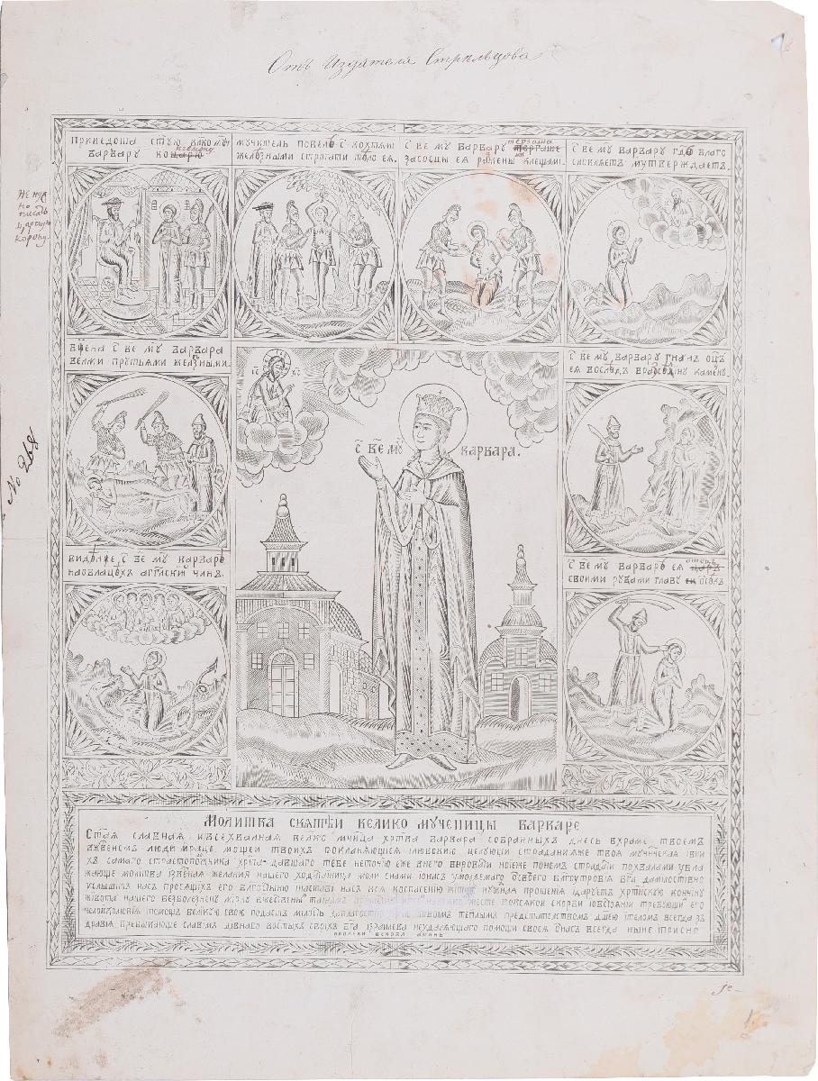 Тексты над клеймами в две строки (с чернильными правками) – 1. «приведоша стую влкомуч. // варвару ко царю»; 2. «мучитель повелѣ с кохтѧмї // желѣзными строгати тѣло еѧ.»; 3. «с ве му варвару торгаше // засосцы еѧ ражены клещамї.»; 4. «с ве му варвару гдь благо // словлѧетъ мутверждаетъ.»; 5. «биена с ве му вар-вара // велми прутьѧми желзными.»; 6. «с ве му варвару гналъ оцъ // еѧ вослѣдъ врассодїну камену.»; 7. «видение с ве му варваре // наоблацехъ агглски чинъ.»; 8. «с ве му варваре еѧ царъ // своими руками главу еи осекъ.». Под изображением в горизонтальной филенке, обрамленной тонкой растительной гирляндой, текст молитвы к св. вмч. Варваре в десяти строках: «МОЛИТВА СВѦТѣИ ВЕЛИКО МУЧЕНИЦЫ ВАРВАРЕ // Стаѧ славнаѧ ивсехвалнаѧ велко мчнца хртва варвара собранныхъ днесь вхраме твоемъ // бжвеномъ людї їраце мощеи твоихъ покланѧющїсѧ їлюбовию целующи страдани ѧже твоѧ мучнчскаѧ ївни // хъ са-маго страстоположника хрта давшаго тебе неточїю еже внего веровати ноїеже по-немъ страдати похвалами убла // жающе молїтва їзвенаѧ желания нашего ходатаїница моли снами їонасъ умолѧемаго освоего блгоутробїѧ Бга дамїлостївно // услышїтъ насъ просѧщїхъ его блгостыню їнаставї насъ всѧ коспасенїю жїтие нужднаѧ прошенїѧ їдаруетъ хртнскую кончїну // жївота нашего безболезнену мїрну бжственым таїнамъ […] вовсѧкои скорби їобстоѧнїи требующим его // человколюбїѧ їпомощъ велїкую свою подастъ мїлость дабла-гост[…] твоїмъ теплымъ предстателствомъ дшею їтеломъ всегда зъ // дравїѧ пребывающе словїмъ дївнаго востыхъ своїхъ Бга їзраилева неудалѧющаго помощи онасъ всегда ныне їприсно // ивовеки вековъ вминь»