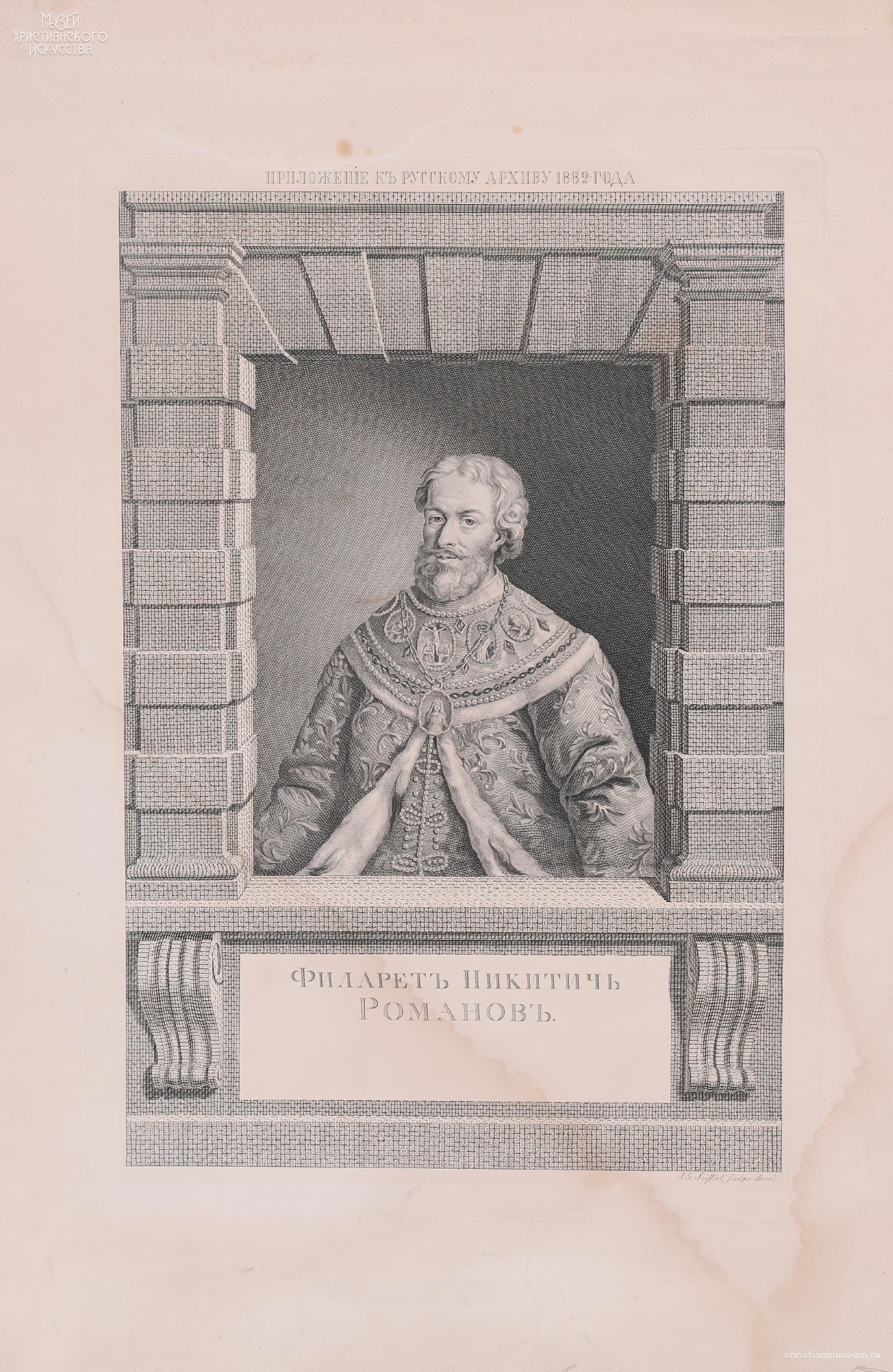 Надпись над изображением - « ПРИЛОЖЕНIЕ КЪ РУССКОМУ АРХИВУ 1882 года»; на постаменте – «Филаретъ Никитичъ // Романовъ.»