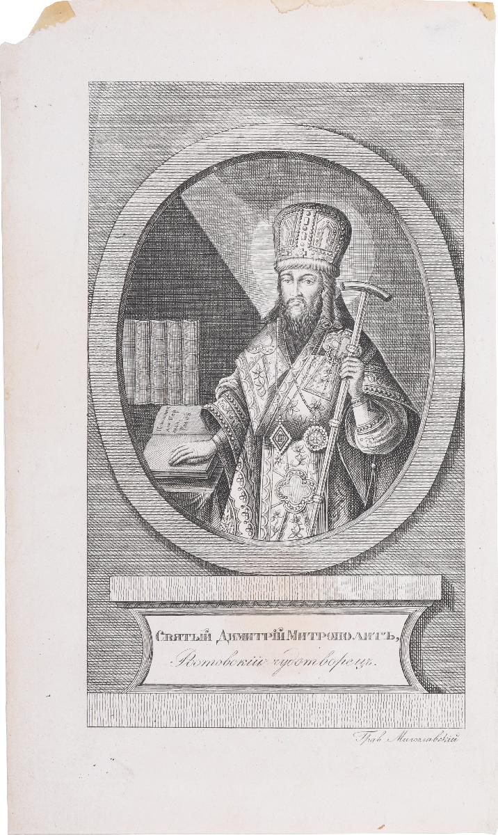 Гравюра с изображением овального победренного портрета митрополита Ростовского Димитрия в 3/4-ом повороте вправо, стоящего рядом со столиком, расположенном слева, в правой руке посох, левая положена на раскрытую книгу, лежащую на столешнице, за ней стоят еще четыре тома. Одет в саккос, омофор, на голове митра. Вокруг головы светлый нимб, на голову падает сверху слева световой луч. Рама овальная широкая плоская, стоит на постаменте с высокой верхней плитой и вогнутыми боковыми сторонами. На передней стороне в филенке надпись - «Святый Димитрiй Митрополитъ, // Ростовскiй чудотворецъ.» Портрет и постамент помещены на плоском прямоугольном фоне.