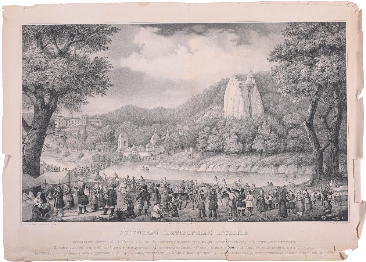 Литография с изображением панорамного вида Святогорского монастыря, снятого с высокой точки зрения. На первом плане, ограниченной кулисами высоких деревьев, показаны берег реки с фигурками молящихся и идущих людей, река с мостом и лодкой. На втором плане среди холмистой местности со скалой изображен ансамбль береговых, протянувшихся вдоль берега, и скальных храмов и строений. Среди леса справа видна многомаршевая лестница, ведущая к скале, по ней двигаются паломники. Слева на холме виден усадебный дом рода князей Потемкиных. Лесистые холмы закрывают горизонт. Небо в облаках.