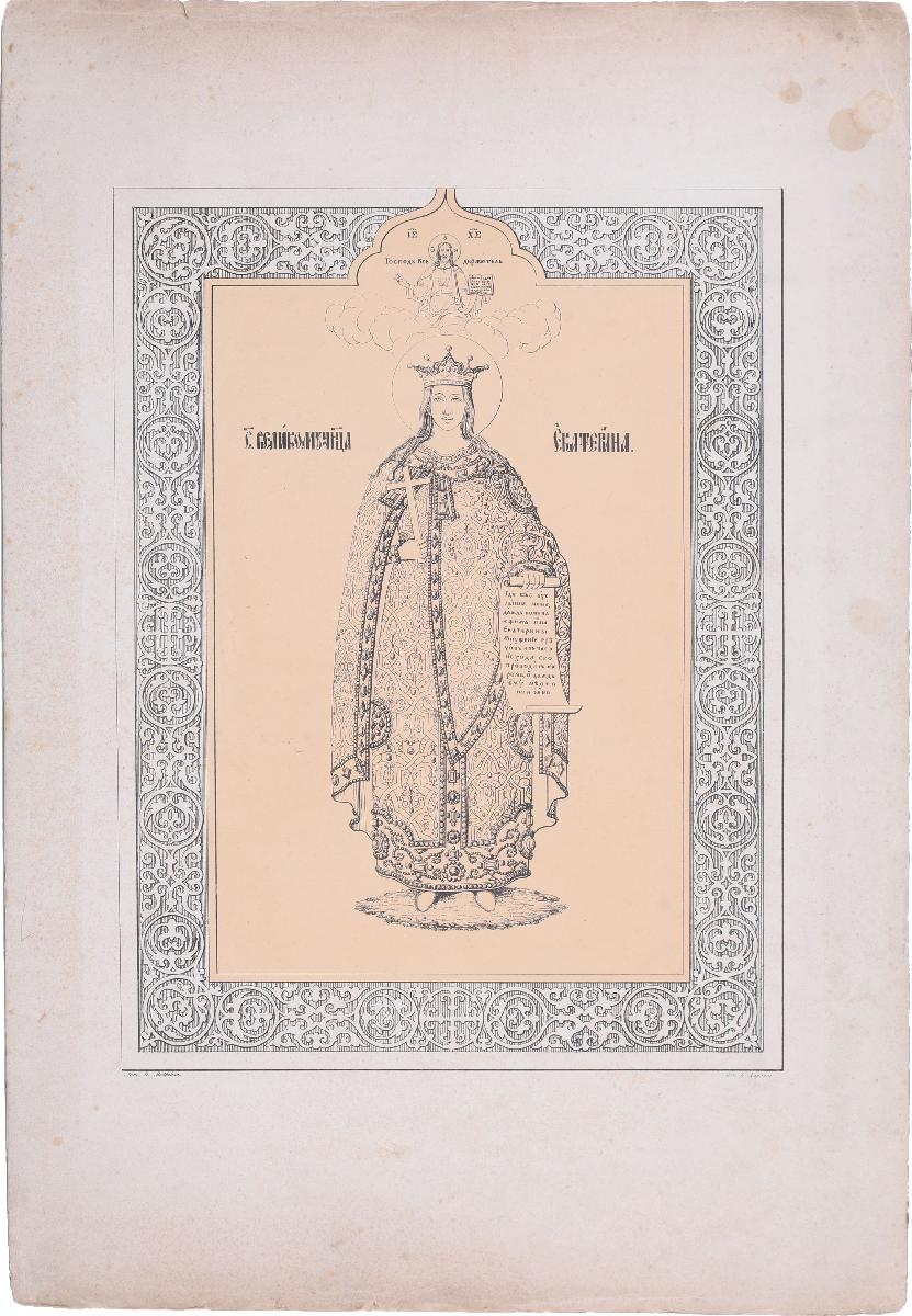 Литография с изображением в прямоугольной декорированной древней растительной плетенкой по заштрихованной вертикальными линиями рамке на охристом фоне средника ростовой прямоличной фигуры Св. Великомученицы Екатерины, стоящей на маленьком поземе. В правой руке крест, который Святая держит перед грудью, в левой опущенной руке развернутый свиток с текстом «Гди Бже оус- // лыши менè, // дáждь помина- // ющимъ имѧ // Екатерины // ѿпущенïе грѣ- // ховъ и въ часъ // исхóда егò // проводи съ ми- // ромъ, и даждь êму мѣсто // покóйно.» Великомученица предстает в княжеских одеяниях, расшитых жемчугом, камнями и дробницами, на голове корона, волосы распущены по плечам. По сторонам от плеч надпись - «С. ВЕЛИКОМУЧЕНИЦА - ЕКАТЕРИНА.». Над нимбом в облачном сиянии сидящий Господь Вседержитель с раскрытой книгой в левой руке и благословляющей правой рукой. Над нимбом Его по сторонам «IΣ - XΣ», над плечами - «Господь Все-держитель».