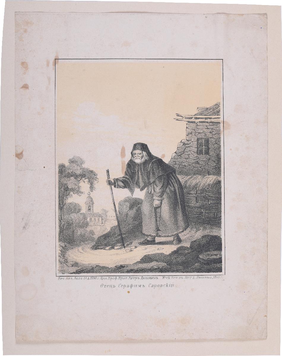 Литография с изображением в прямоугольной линейной рамке на первом плане согбенной фигуры идущего по дорожке старца Серафима Саровского, опирающегося правой рукой на палку, в левой опущенной руке держащего четки с крестиком. Старец одет в темную подпоясанную рясу и кожаную полумантию, на голове низкий клобук с пологом. За его спиной видны часть сложенной из камней кельи, плетень и большой каменный увал на повороте дорожки. Вдали за деревьями слева видны строения пустыни с невысокой колокольней и домиками келий. Оттиск сделан охристой и черной красками.