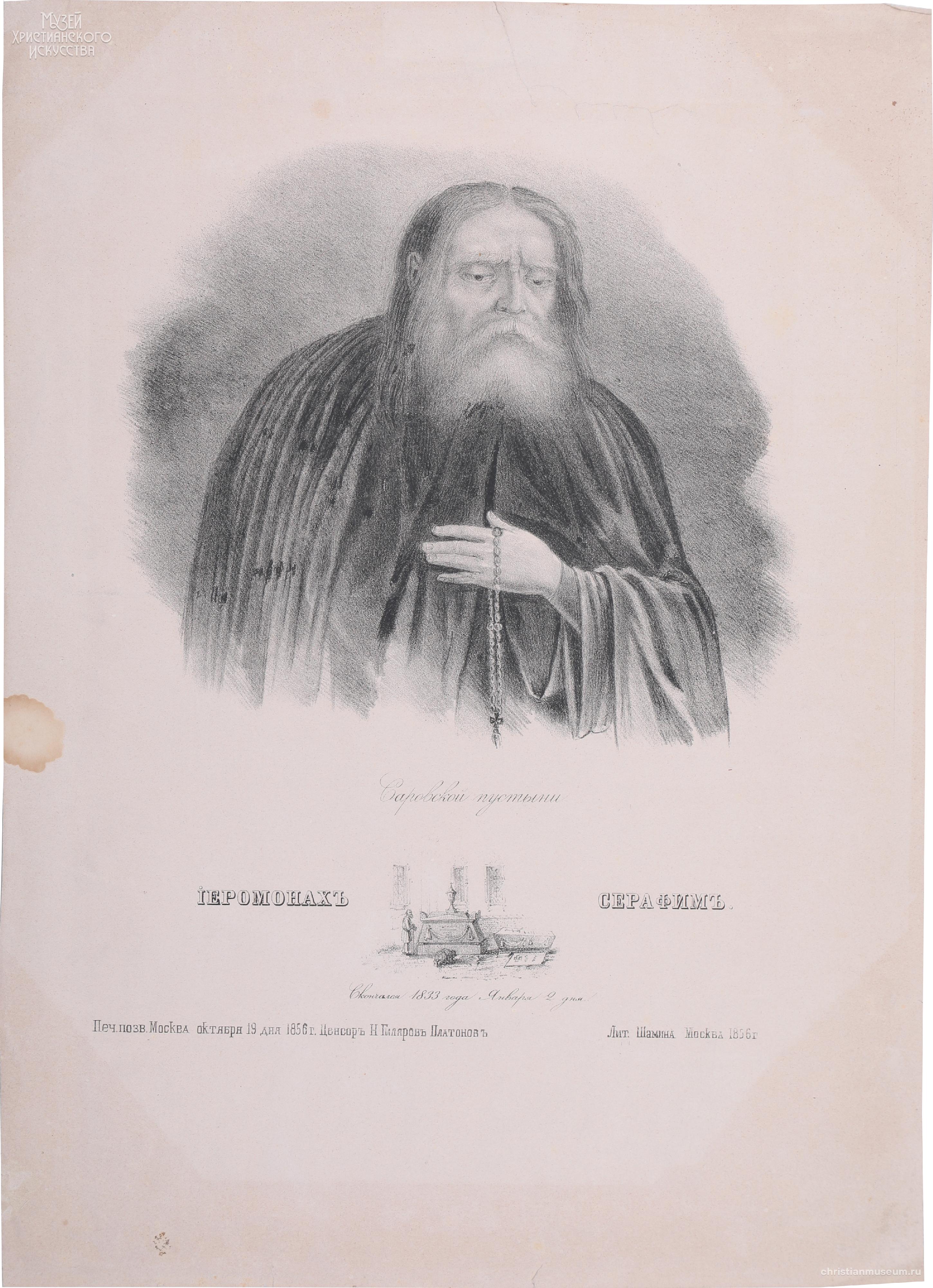 Надпись под изображением - « Саровской пустыни // IЕРОМОНАХЪ - СЕРАФИМЪ. // Скончался 1833 года Января 2 дня.»