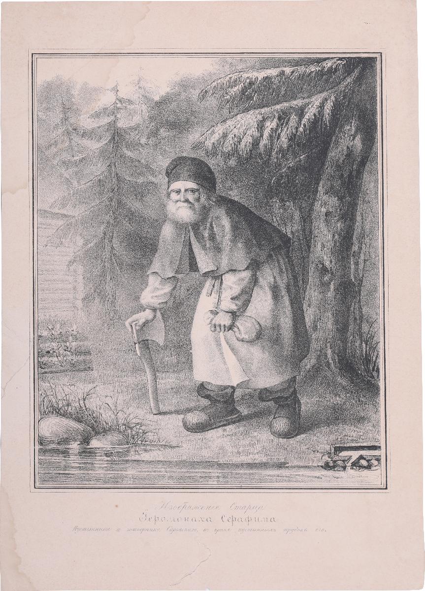 Литография с изображением в прямоугольной рамке на первом неглубоком плане фигуры стоящего на берегу ручья, согнувшись и опираясь правой рукой на топор, старца Серафима в подпоясанной рясе и кожаной полумантии, скуфье, лаптях, с мешочком в левой руке. За ним справа ствол и нижние ветки мощной ели. В глубине виден еловый лес, слева угол строящейся кельи, перед которой на земле лежат срубленные стволы деревьев с мелкими веточками.