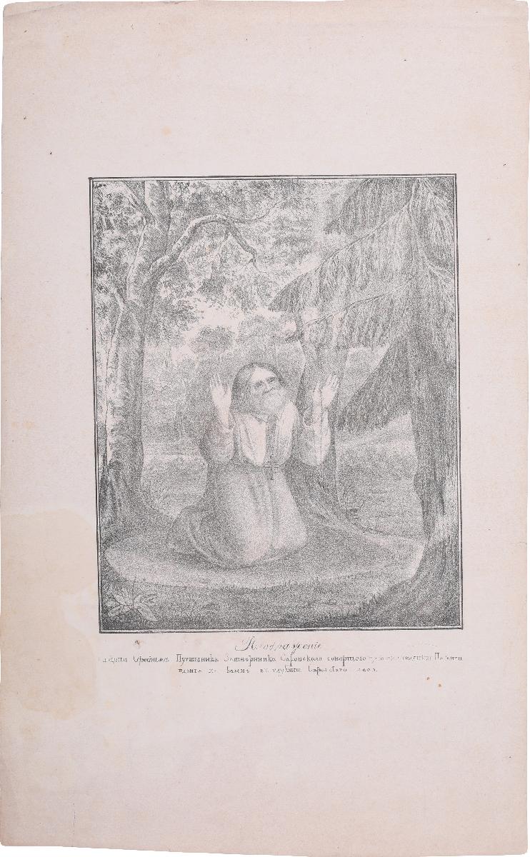 Литография с изображением в прямоугольной линейной рамке на первом плане среди деревьев леса стоящего на коленях с поднятыми в молении руками на уплощенном камне старца Серафима Саровского с четырехконечным крестом на груди и четками на левой руке в повороте влево. За ним лесная чаща.