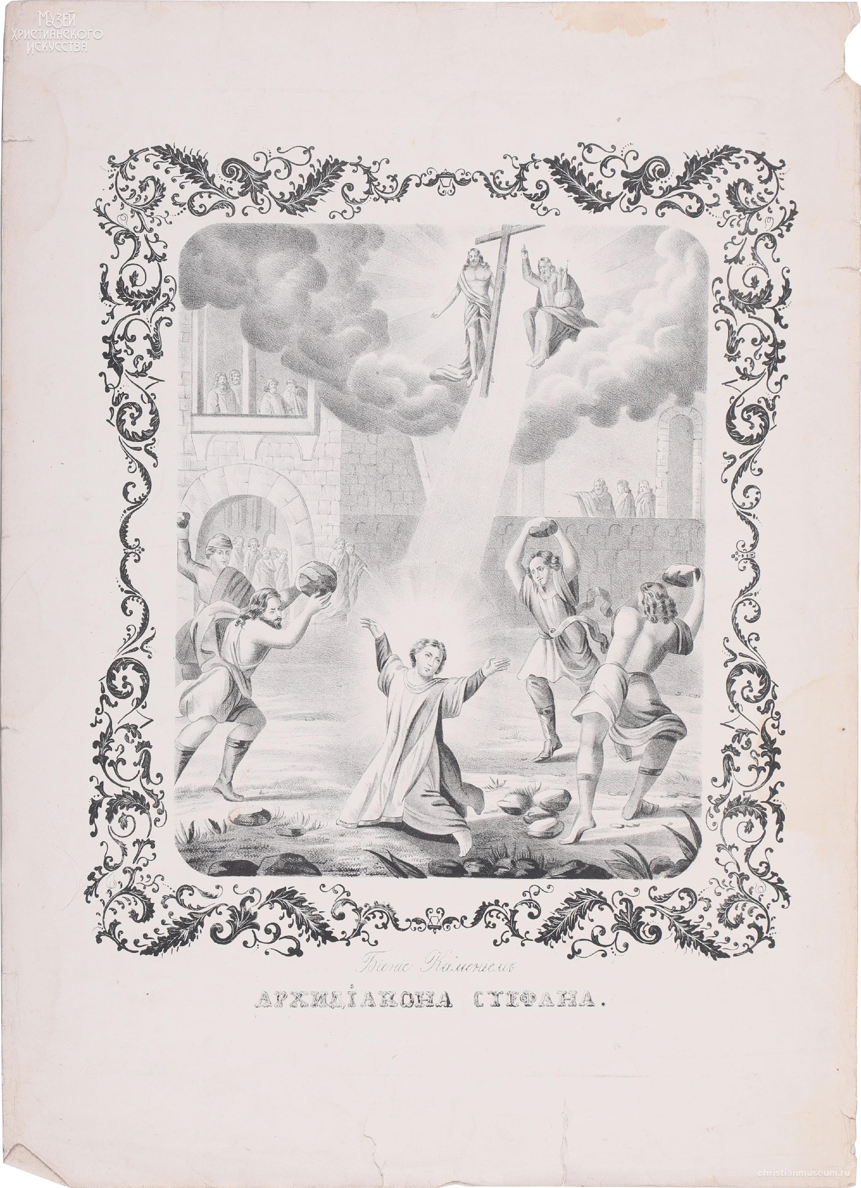 Литография с изображением в прямоугольнике со скругленными углами сцены избивания архидиакона Стефана камнями. На первом плане в центре фигурка стоящего на коленях с воздетыми и разведенными в стороны руками Стефана, вокруг него три язычника, замахнувшихся камнями на архидиакона. Вокруг головы Стефана лучевое сияние-нимб, на который с небес падает луч света, исходящий от небесного сияния вверху, где среди развергшихся облаков фигуры сидящего на облаке и благославляющего Саваофа со сферой и стоящего воскресшего Христа, поддерживающего правой рукой крест. На втором плане стена и башни города, в окнах, въездных Овчих воротах и на террасе видны фигурки горожан, наблюдающих за происходящим избиением. Вокруг изображения декоративная рамка, орнамент которой составлен из насыщенных растительными элементами угловых частей и облегченных середин тонких волютообразных побегов из длинных рассеченных листьев и усиков.