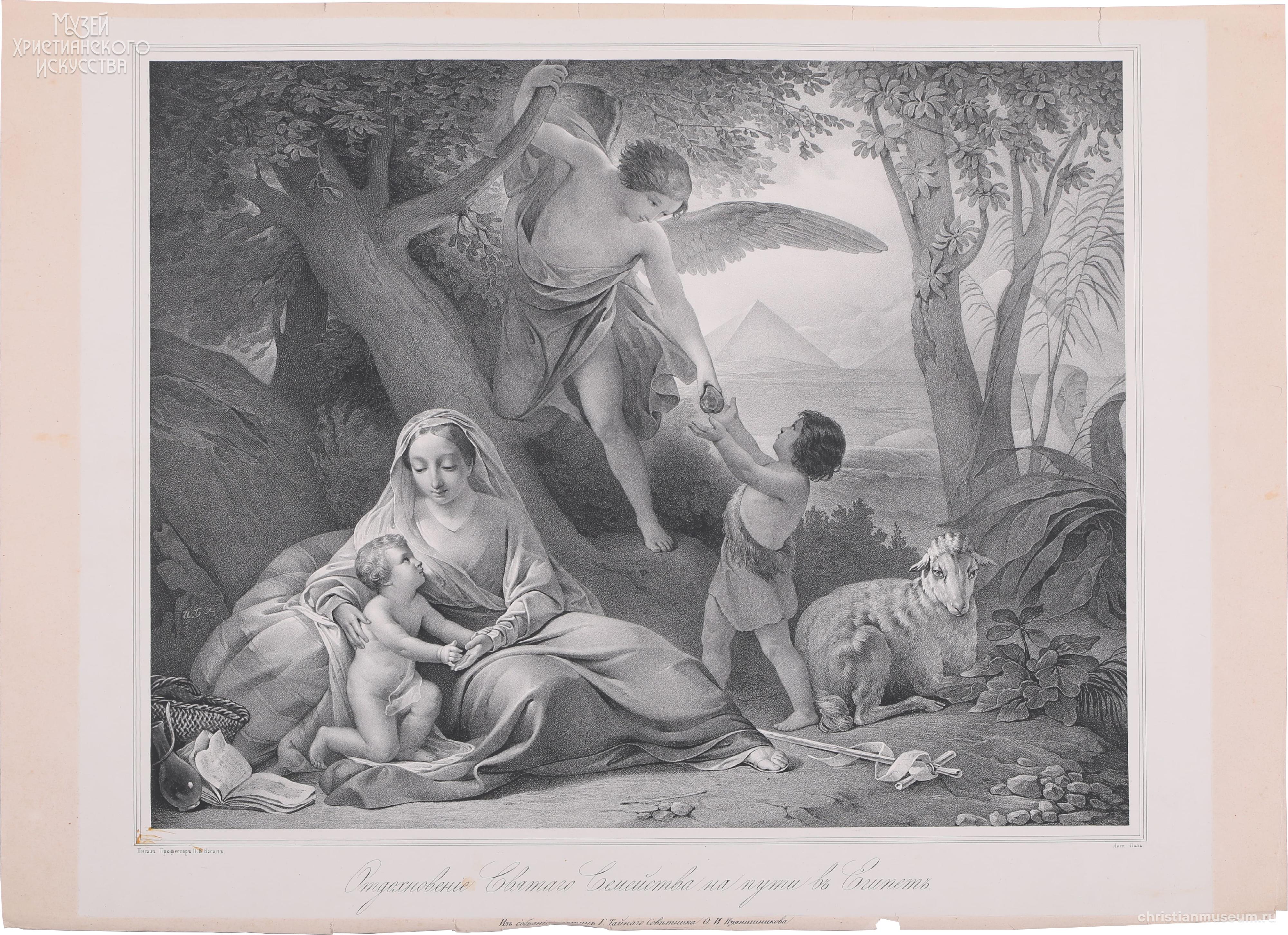 Надпись под рамкой - «Отдохновенiе Святаго Семейства на пути въ Египетъ. // изъ собранiя картинъ Г. Тайнаго Совљтника Ѳ.И. Прянишникова.»
