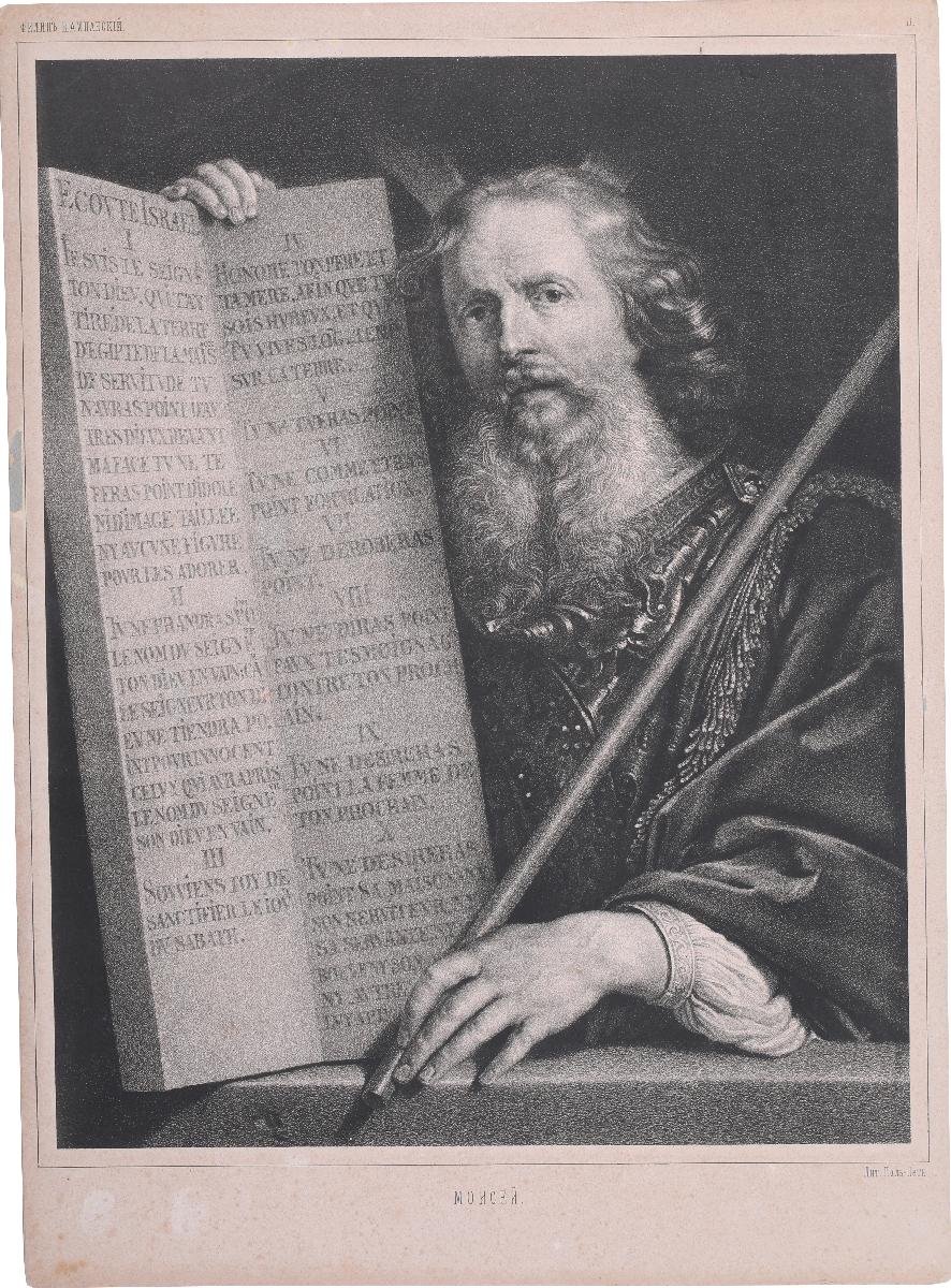 Литография с изображением в прямоугольной линейной рамке репродукции картины «Пророк Моисей» из Императорского Эрмитажа. В неглубоком пространстве, ограниченном впереди плитой каменного парапета, расположена поясная фигура Пророка в пышном расшитом плаще, из-под которого виден рукав белой рубахи, застегнутый на запястье левой руки, ладонь которой положена на парапет и удерживает конец жезла, лежащего на левом плече. Справа на парапете стоят скрижали, поддерживаемые правой рукой. Лицо обрамлено вьющимися прядями волос на голове и бороде. На скрижалях помещены тексты десяти заповедей на латинском языке. Фон за фигурой темный, в котором теряется свет двух лучей, исходящих от головы Пророка.