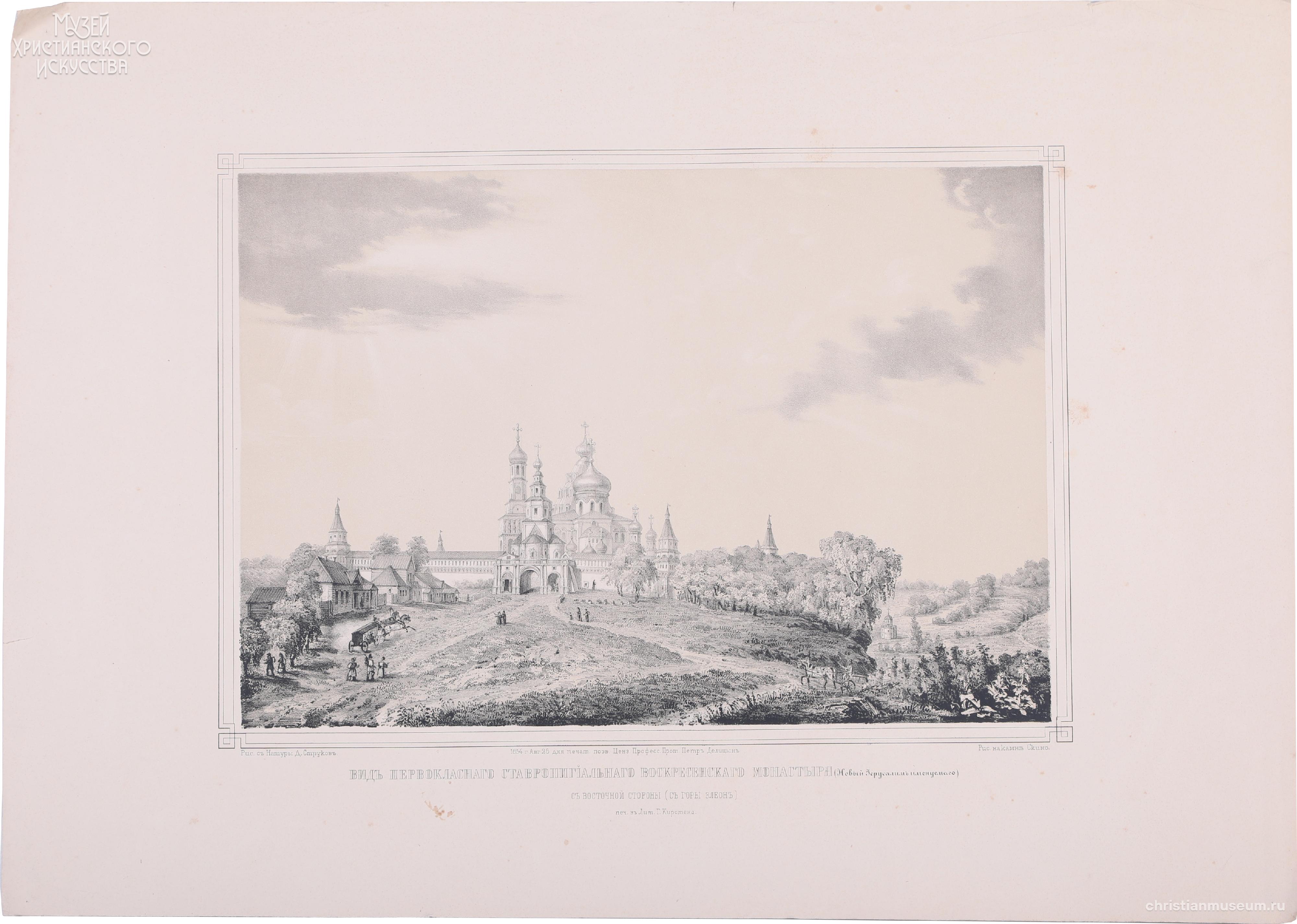 Литография с изображением вида Ново-Иерусалимского монастыря, снятого с дальней точки. На первом плане изображен склон холма, по которому слева поднимается ряд домиков, справа долина реки с часовней вдали и рощей под стеной обители. В глубине панорамное изображение монастыря с главными воротами, надвратной церковью и Воскресенским собором за ними.