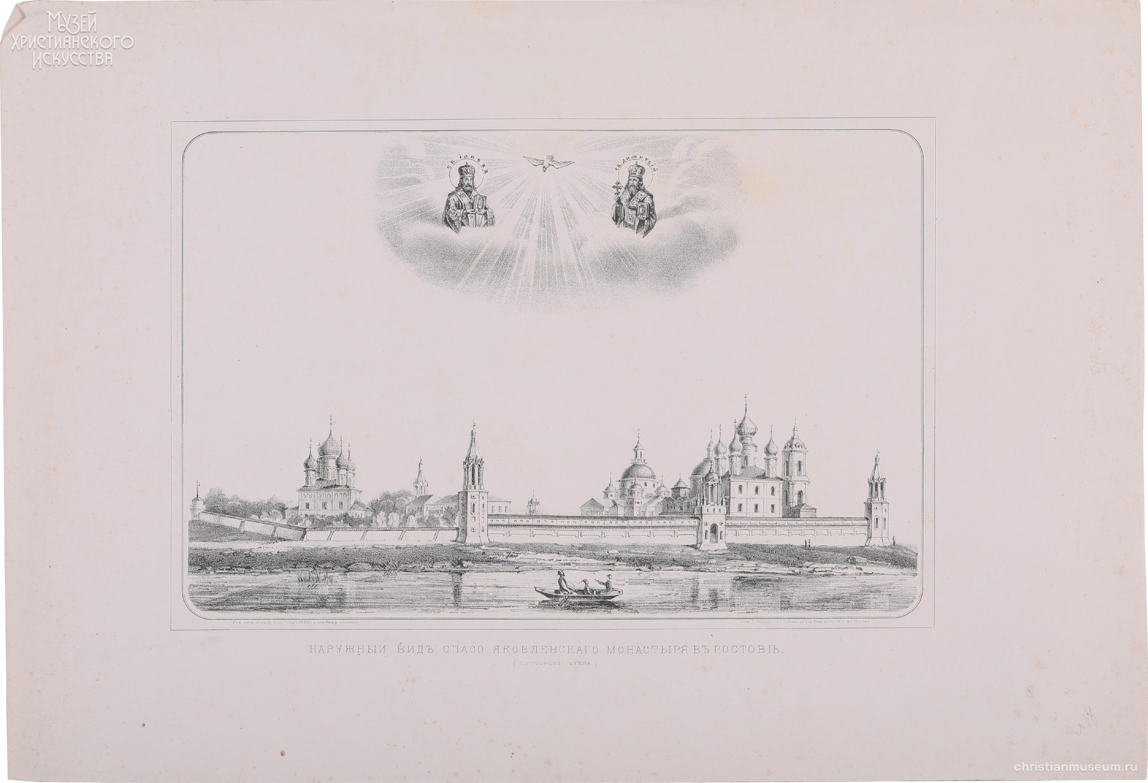 Литография с изображением панорамного вида Спасо-Яковлевского монастыря, занимающего всю ширину картинной плоскости. На первом неглубоком плане гладь воды озера Неро с лодкой. На втором плане на берегу возвышаются стены с высокими «готическими» башнями, над которыми высятся храмы и видны крыши хозяйственных строений, кроны деревьев. В небесной сфере лучевое сияние со Святым Духом и предстоящие ему Свт. Иаков и Свт. Димитрий Ростовский с подписями по контуру нимбов.