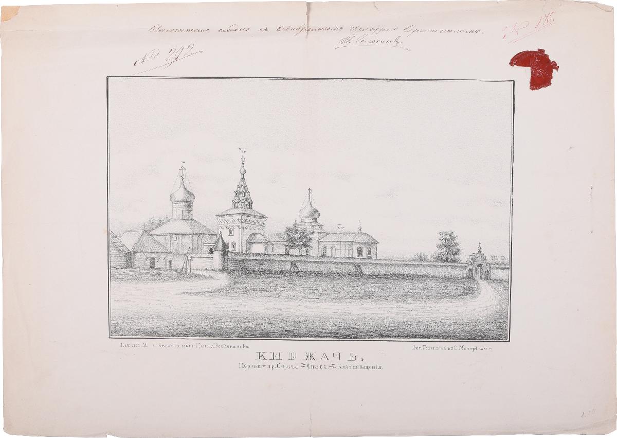 Литография с изображением панорамного вида храмов бывшего Благовещенского монастыря в Киржаче. На первом плане открытое пространство с дорогой, на втором над монастырской стеной видны три храма, показанные чередой друг за другом - церкви во имя преподобного Сергия Радонежского, Спасская и Благовещенская. справа у края входные ворота с маковкой.