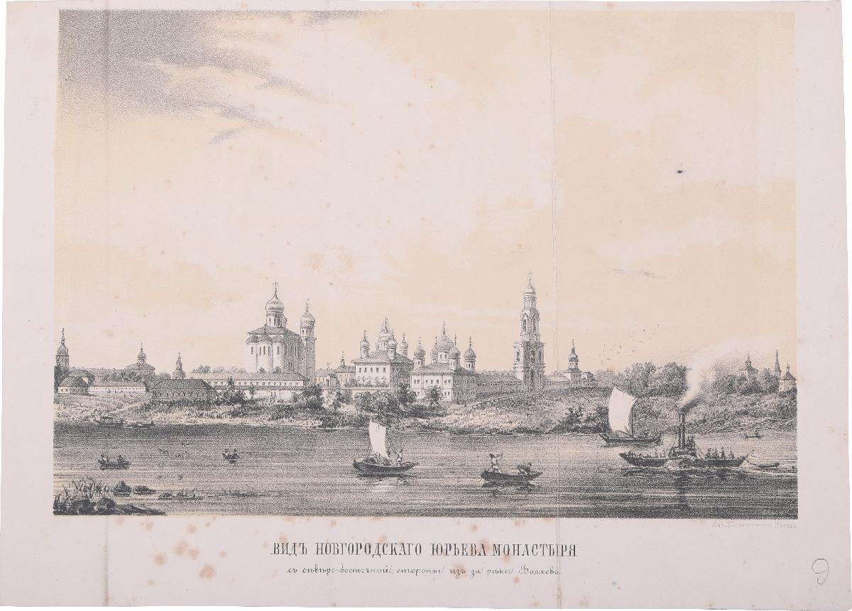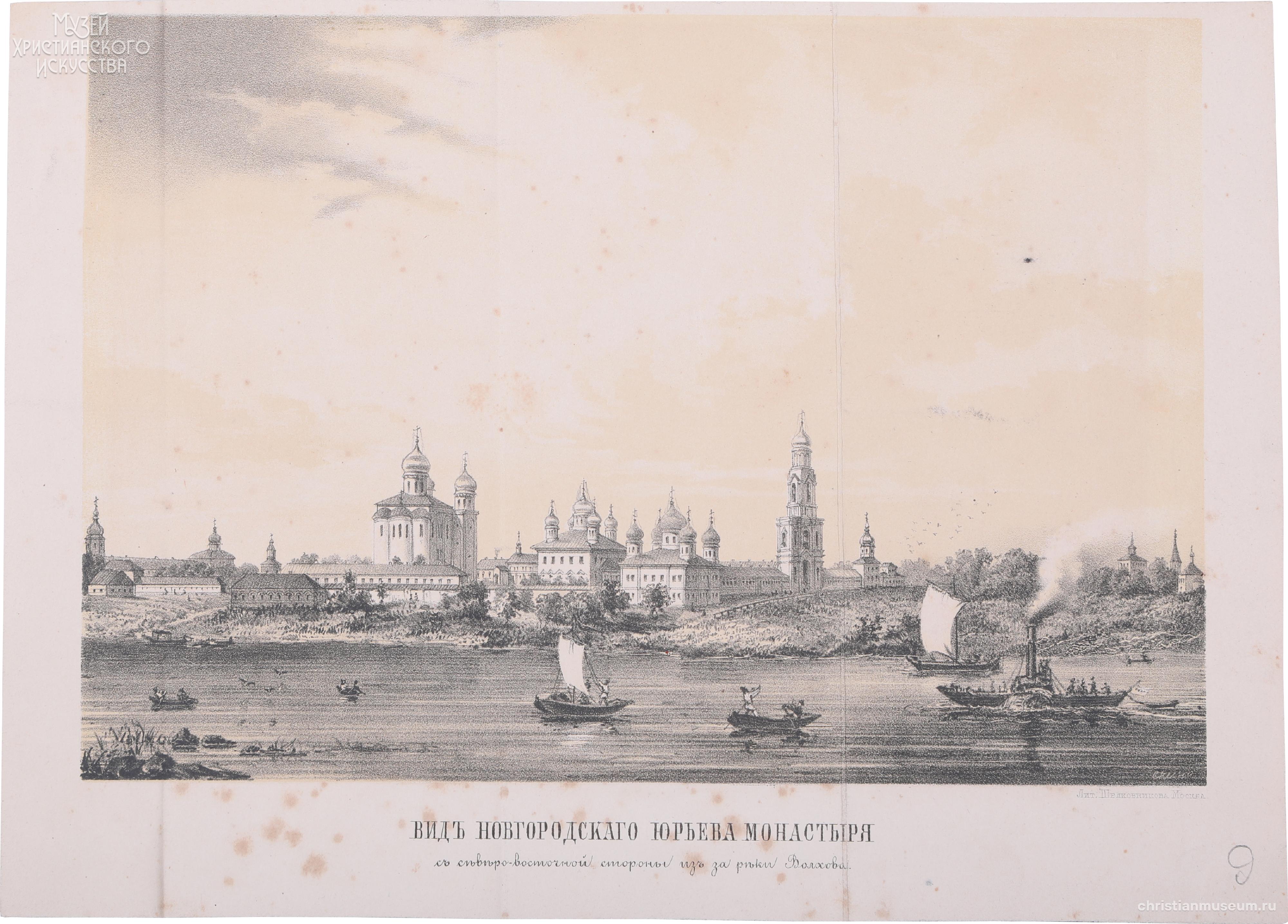 Литография с изображением панорамного вида древнего Георгиевского монастыря. На первом плане показана река с лодками и колесным паровым пароходом. На противоположном берегу простерся ансамбль обители с древнейшим русским храмом слева и многоярусной колокольней справа над стеной, над которой возвышаются храмы и хозяйственные строения. Справа от монастыря небольшая роща над деревьями которой видны главы скитских построек.