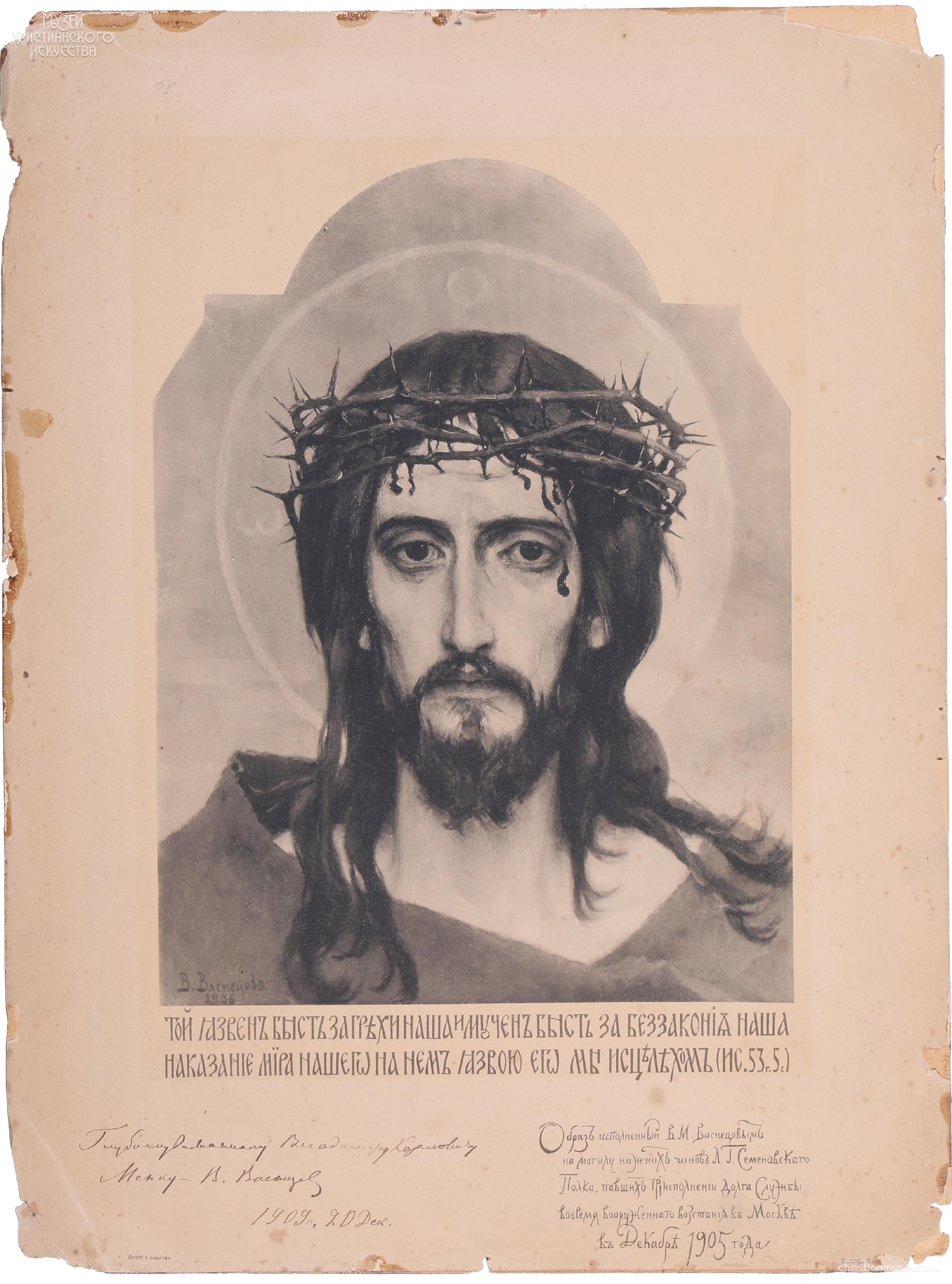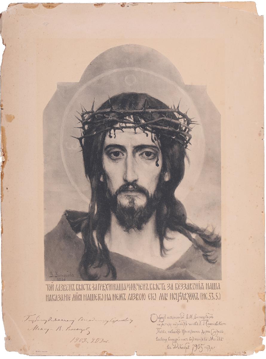Фототипия представляет копию известной иконы В.М. Васнецова «Спаситель в терновом венце», которую художник написал в 1906 году для собора в честь Введения во храм Пресвятой Богородицы - полковой церкви лейб-гвардии Семеновского полка, построенной в 1837 - 1842 годах по Проекту Константина Тона в Петербурге. Киот с иконой был установлен на мраморной гробнице, в которой покоились останки троих семёновцев, погибших при подавлении волнений в Москве в декабре 1905 года, и командира полка генерал-майора Г.А. Мина, убитого в результате теракта в августе 1906 года. Собор был разрушен в 1933 году. Образ «Спаса в терновом венце» после 1934 года считается утраченным. В.М Васнецов дарил фототипии близким друзьям и почитателям его таланта.