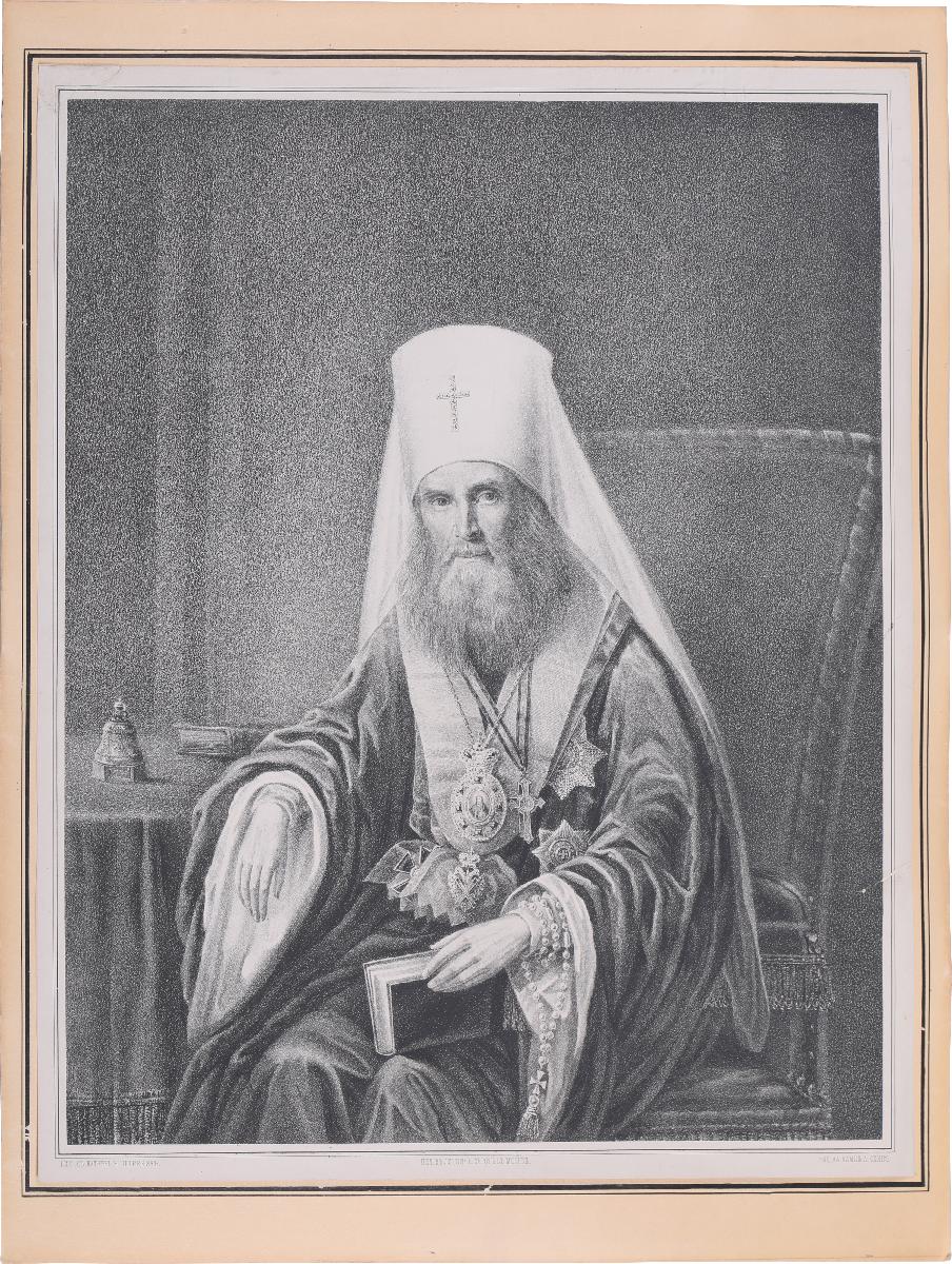 Атрибуция: Портрет был литографирован по портрету митрополита Филарета (Дроздова), написанному московским художником Н.Д. Шпревичем в 1860 году (в настоящее время хранится в ММДА ЦАК) подписан именем литографа А.Т. Скино.