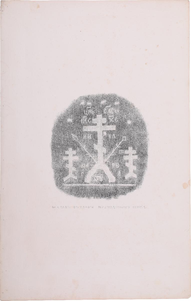 Литография с изображением аналава с главы преподобного Сергия из ткани с нашитыми Голгофским крестом и двумя восьмиконечными крестами, и надписями по краю аналава (утрачены).