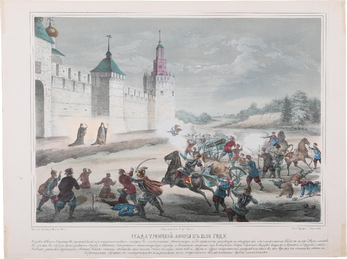 Надпись под изображением - «ОСАДА ТРОИЦКОЙ ЛАВРЫ ВЪ 1608 ГОДУ.»; «Казакъ Иванъ Рязанецъ, пришедшiй изъ непрiятельскаго лагеря въ осажденный Монастырь, подъ присягою разсказалъ старцамъ, что непрiятели видђли ночью двухъ иноковъ // въ схимђ, въ образђ Преподобныхъ Сергiя и Никона, обходящихъ монастырскую ограду со внђшней стороны, изъ которыхъ одинъ держалъ въ рукђ кадило и крестъ, а другой, слђдо-// вавшiй занимъ, окроплялъ святою водою стђны обители при пђнiи «Спаси Господи, люди твоя». Пули и ядра непрiятелей, направляемыя въ это время къ стђнамъ обители, // возвращались обратно къ осаждающимъ и поражали ихъ, непричиняя нималђйшаго вреда осажденымъ.»