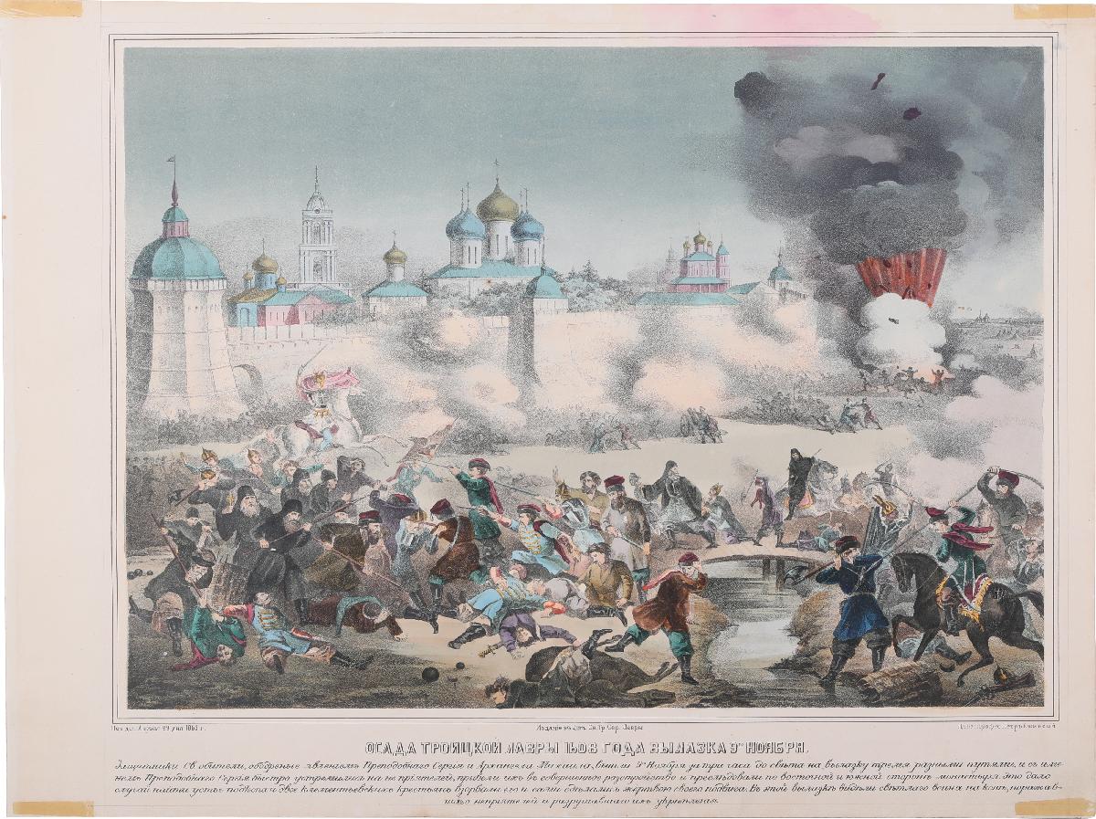 Литография с изображением момента ночной вылазки осажденных 9 ноября 1608 года. На первом плане изображено побоище с южной стороны монастыря на берегах речки. Справа над сражающимися монахами и поляками скачет светлый воин на белом коне с мечом в руке. На втором плане за клубами дымов от сражения у подножья стены показана панорама монастыря с трехъярусной колокольней, надвратной церковью Св. Иоанна Предтечи и Митрополичьими покоями. Слева у Пятницкой башни изображены дым и пламя при взрыве подкопа, в глубине видны палатки лагеря неприятелей и слободская церковь.
