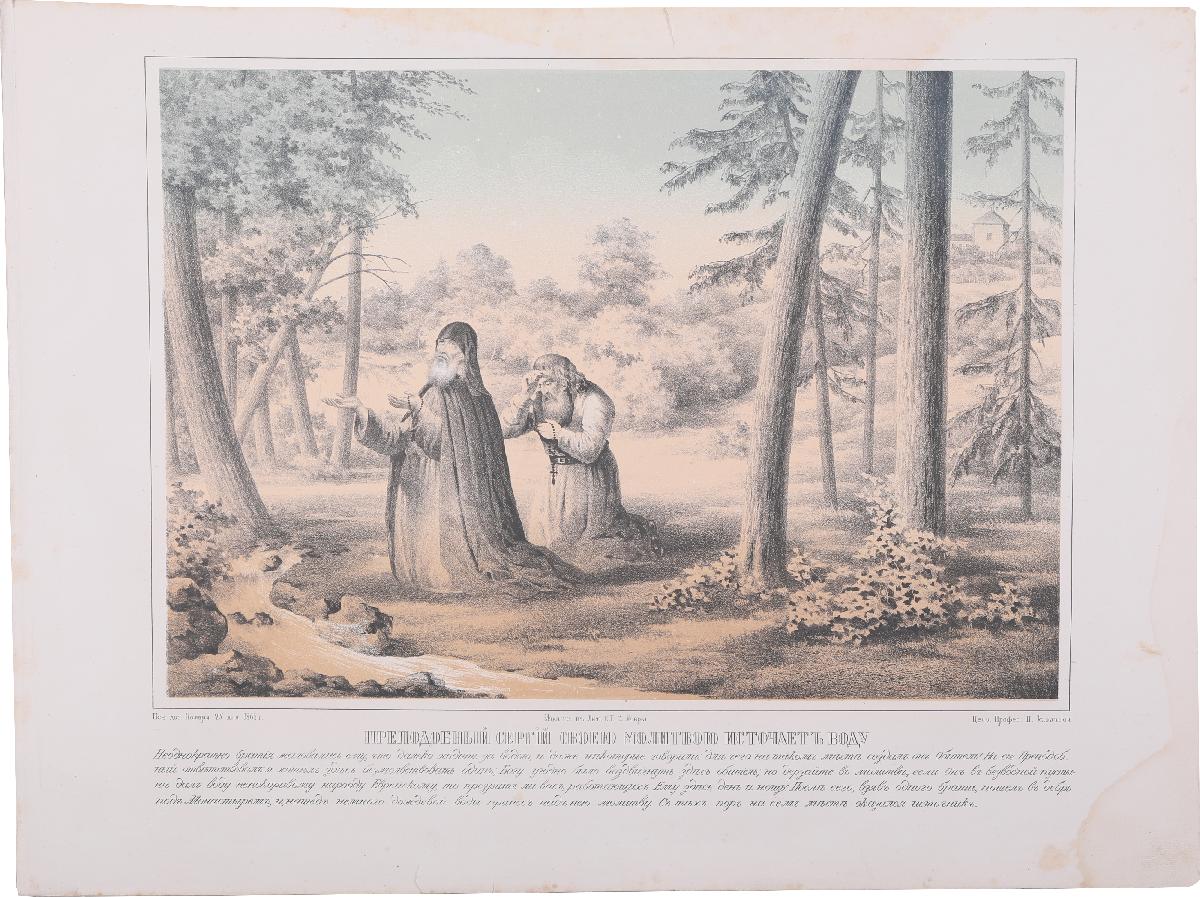 Надпись под изображением – «ПРЕПОДОБНЫЙ СЕРГIЙ СВОЕЮ МОЛИТВОЮ ИСТОЧАЕТЪ ВОДУ. // Неоднократно братiя жаловались ему, что далеко ходить за водою, и даже нђкоторые говорили: для чего на такомъ мђстђ создалъ онъ Обитель? На сiе Преподоб- // ный отвђтствовалъ: я хотђлъ здђсь безмолствовать одинъ: Богу угодно было воздвигнуть здђсь обитель но дерзайте въ молитвђ если онъ въ безводной пусты- // нђ далъ воду непокоривому народу Еврейскому то презритъ ли васъ, работающихъ Ему здђсь день и нощь? Послђ сего, взявъ одного брата пошелъ въ дебрь // под Монастыремъ, и, нашедъ немного дождевой воды принес надъ нею молитву. Съ тђх поръ на семъ мђстђ оказался источникъ.»