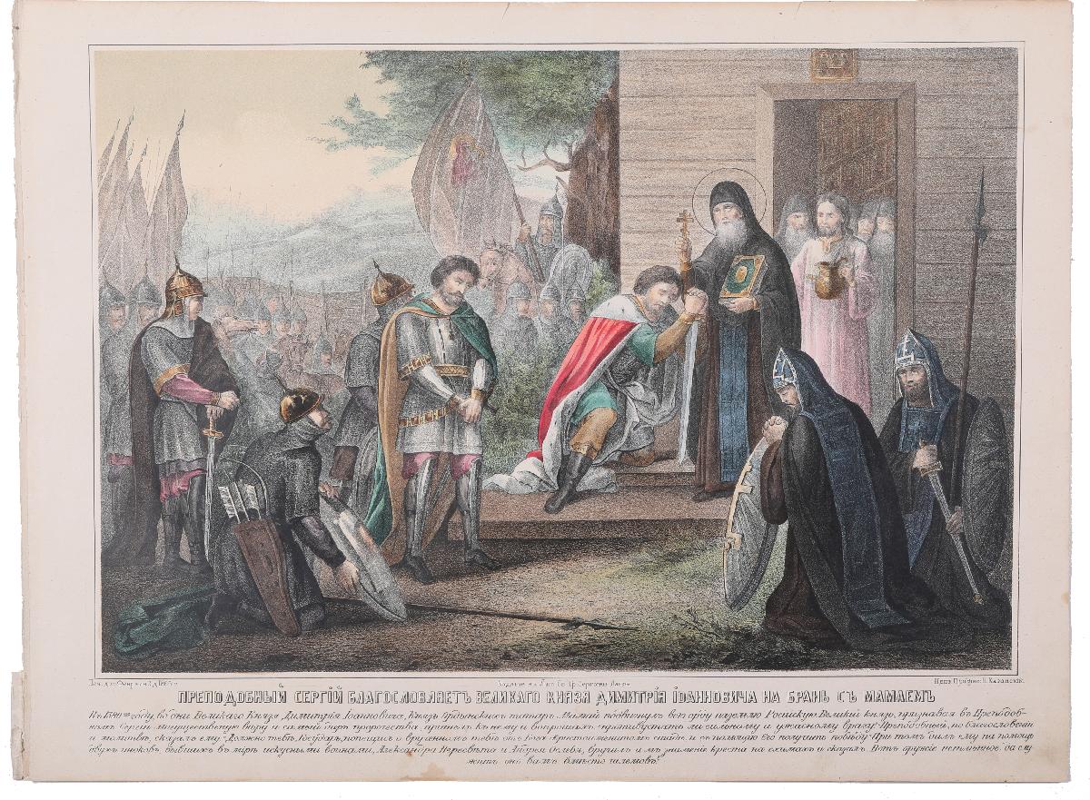 Литография с изображением на первом плане Преподобного Сергия, стоящего справа перед храмом и благословляющего на ступенях коленопреклоненного Великого князя Дмитрия, справа от Сергия стоящие на коленях Пересвет и Ослябя в схимах. Слева за фигурой князя Димитрия находятся воины его дружины. Вдали холмы.