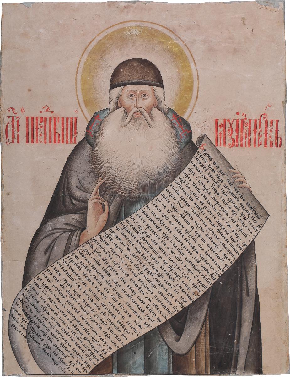 Поколенная фигура расположена прямолично, занимая все пространство, Десница поднята в благословляющем жесте, левая рука держит развернутый свиток за верхний край. Заполненный текстом свиток расположен по диагонали перед фигурой. По сторонам ее около плеч надпись - «АI ПРЕПДБНИ - МАѮИМЪ ГРЕКЪ». Рисунок выполнен телесной, розоватой, коричневой, серой, бирюзовой, голубой, красной, золотистой красками.