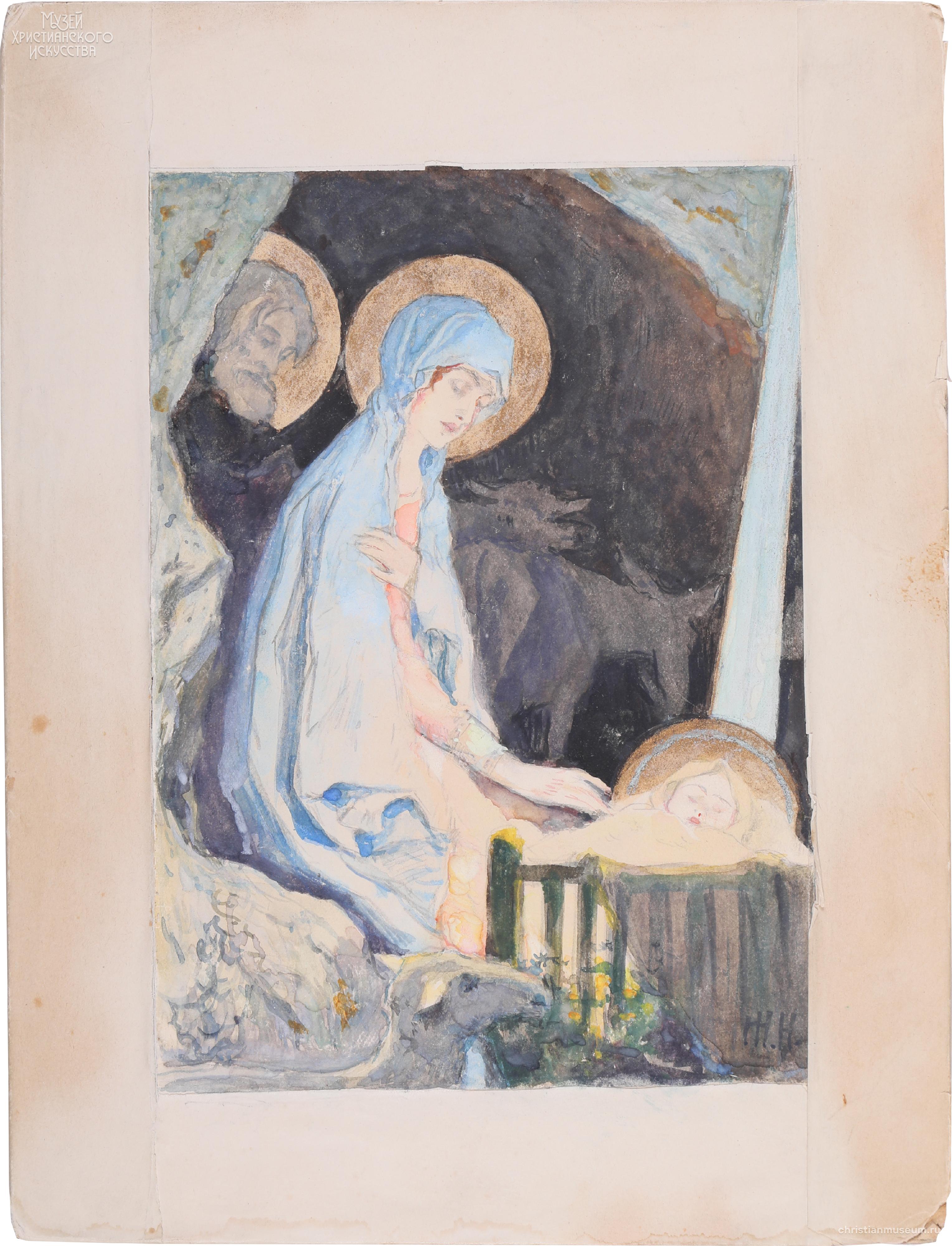 Рисунок с изображением Рождества Христова. В неглубоком ярко освященном мягким светом пространстве перед входом в пещеру слева на выступе камня сидит Пресвятая Богородица, слегка склонившись над спящим спеленутым Младенцем, лежащим в яслях. На него с неба падает голубоватый луч света. Соединение световых потоков создает мерцание нежных красок, подчеркивая тишину и придавая умиленность происходящему. Позади Марии стоит, не нарушая соединения Матери и Младенца, праведный Иосиф, перед яслями фигурка ягненка. В затемненной глубине пещеры видны домашние животные, намеченные художником общими силуэтными пятнами.