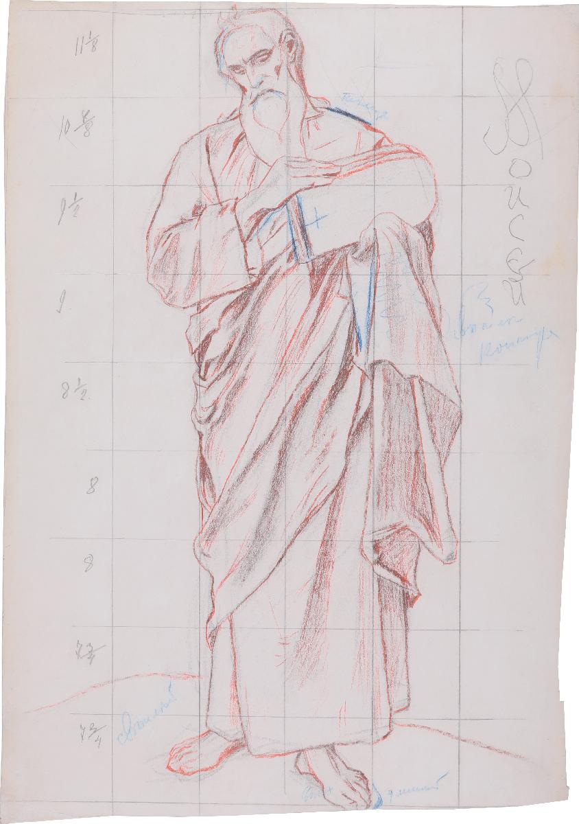Рисунок красным и синим карандашом ростового изображения мужской фигуры с бородой, одетой в тунику. В руках сложенные текстом внутрь каменные скрижали, закругленные вверху. Ноги босые, голова склонена к правому плечу. На рисунок наложена масштабная сетка с коректирующими пометами самого автора.